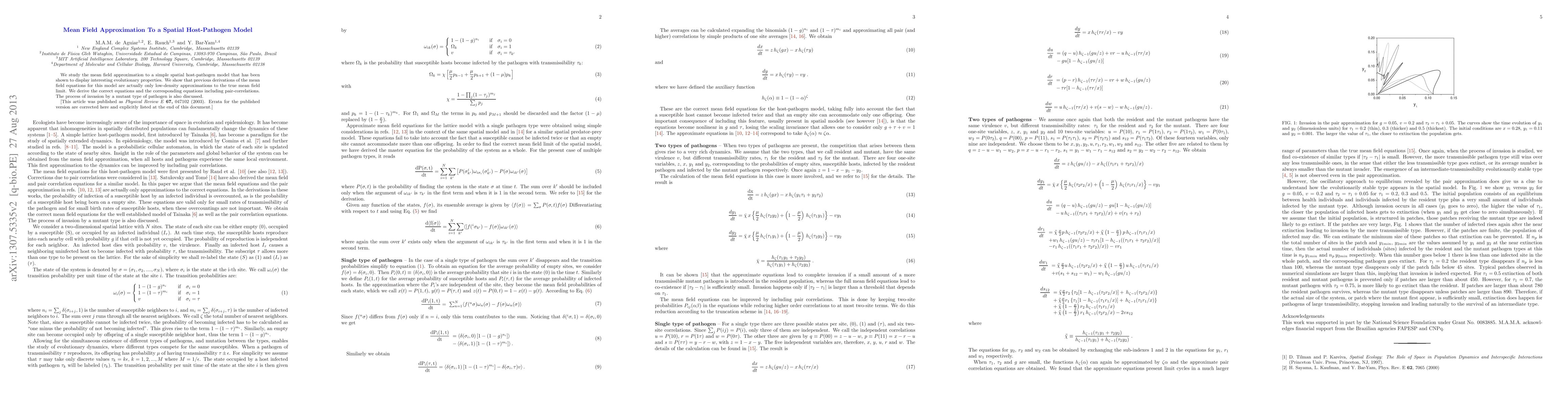 This paper corrects previous derivations of mean field equations for a spatial host-pathogen model, deriving the true mean field limit and including pair-correlations. It also discusses the process of invasion by a mutant pathogen type and lists errata for the original published version.