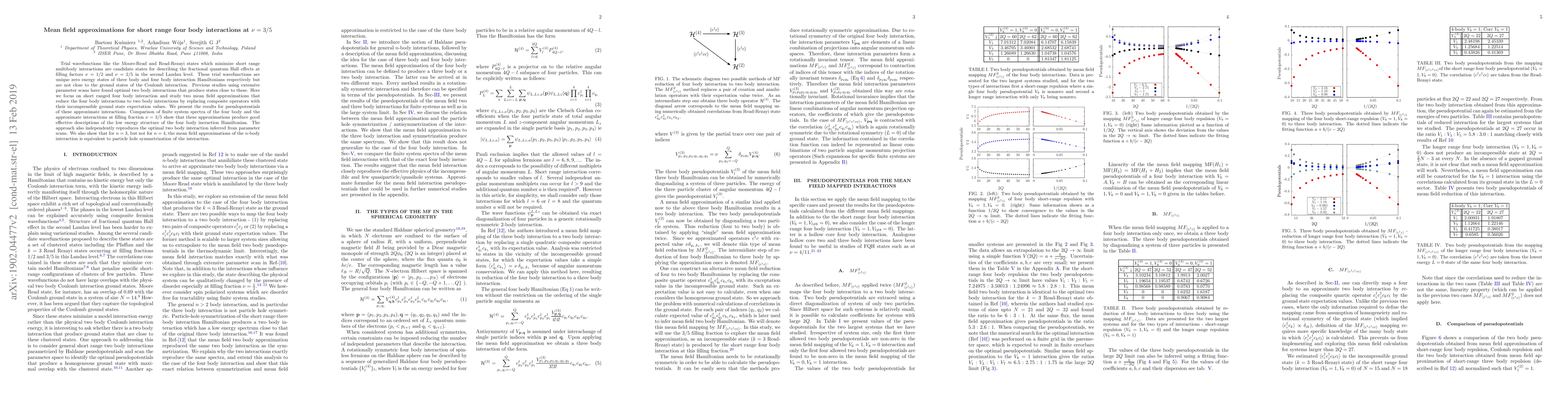 This paper investigates mean field approximations for short range four-body interactions at the filling factor $\nu=3/5$, demonstrating their effectiveness in describing the low-energy structure of the four-body interaction Hamiltonian. The study shows that the approximations reproduce optimal two-body interactions and are equivalent to particle-hole symmetrization for $n=3$.
