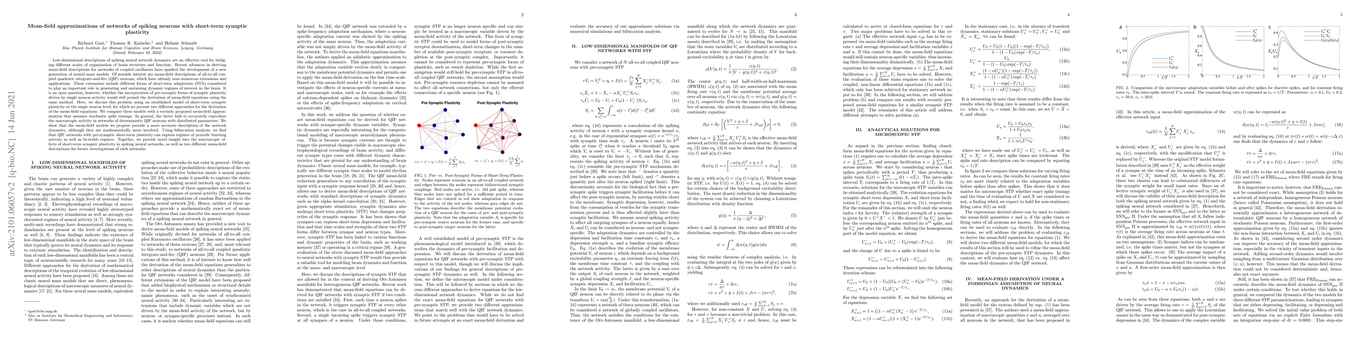 This paper develops mean-field approximations for networks of spiking neurons with short-term synaptic plasticity, comparing two derivation methods against a stochastic spike timing model. The proposed mean-field models more accurately describe network dynamics and reveal periodic bursting and bi-stable regimes.