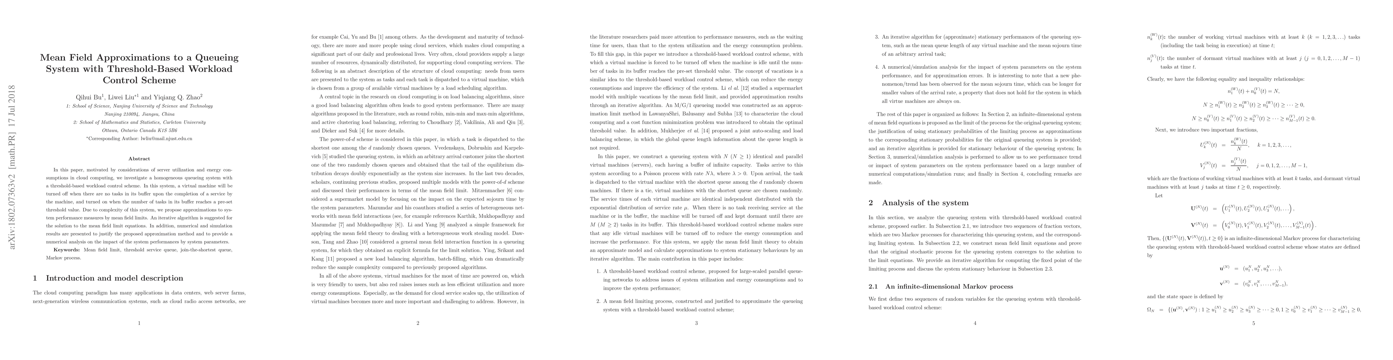 In this paper, motivated by considerations of server utilization and energy consumptions in cloud computing, we investigate a homogeneous queueing system with a threshold-based workload control scheme. In this system, a virtual machine will be turned off when there are no tasks in its buffer upon the completion of a service by the machine, and turned on when the number of tasks in its buffer reaches a pre-set threshold value. Due to complexity of this system, we propose approximations to system performance measures by mean field limits. An iterative algorithm is suggested for the solution to the mean field limit equations. In addition, numerical and simulation results are presented to justify the proposed approximation method and to provide a numerical analysis on the impact of the system performances by system parameters.