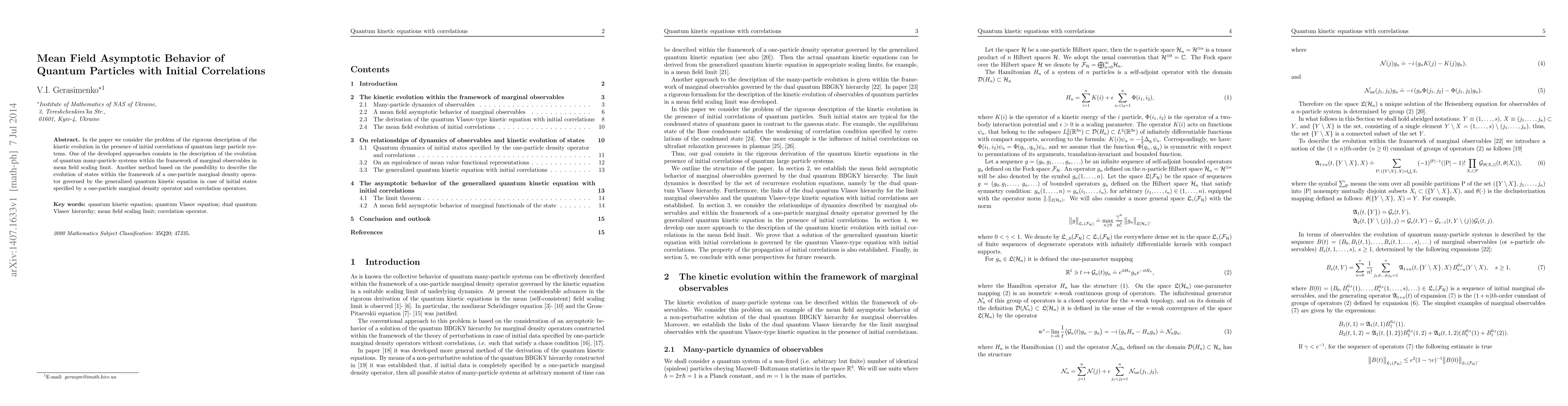 In the paper we consider the problem of the rigorous description of the kinetic evolution in the presence of initial correlations of quantum large particle systems. One of the developed approaches consists in the description of the evolution of quantum many-particle systems within the framework of marginal observables in mean field scaling limit. Another method based on the possibility to describe the evolution of states within the framework of a one-particle marginal density operator governed by the generalized quantum kinetic equation in case of initial states specified by a one-particle marginal density operator and correlation operators.