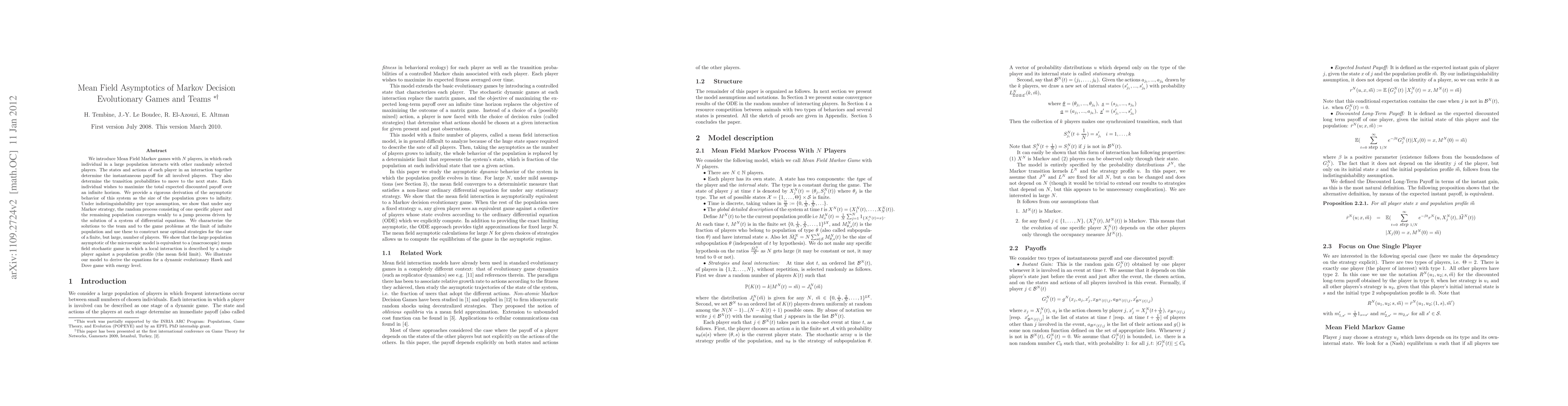 We introduce Mean Field Markov games with $N$ players, in which each individual in a large population interacts with other randomly selected players. The states and actions of each player in an interaction together determine the instantaneous payoff for all involved players. They also determine the transition probabilities to move to the next state. Each individual wishes to maximize the total expected discounted payoff over an infinite horizon. We provide a rigorous derivation of the asymptotic behavior of this system as the size of the population grows to infinity. Under indistinguishability per type assumption, we show that under any Markov strategy, the random process consisting of one specific player and the remaining population converges weakly to a jump process driven by the solution of a system of differential equations. We characterize the solutions to the team and to the game problems at the limit of infinite population and use these to construct near optimal strategies for the case of a finite, but large, number of players. We show that the large population asymptotic of the microscopic model is equivalent to a (macroscopic) mean field stochastic game in which a local interaction is described by a single player against a population profile (the mean field limit). We illustrate our model to derive the equations for a dynamic evolutionary Hawk and Dove game with energy level.
