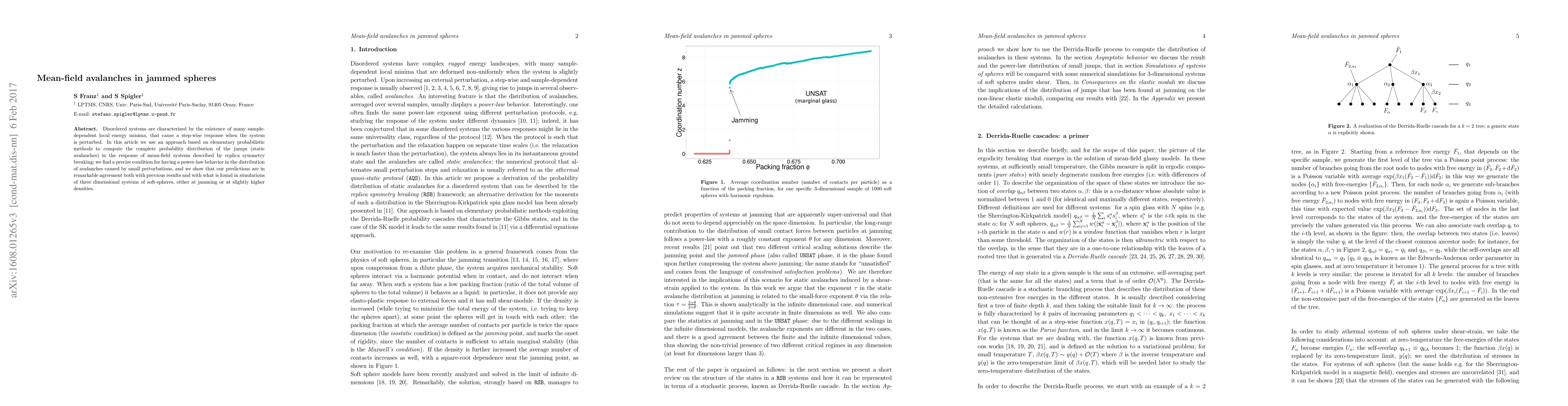 Disordered systems are characterized by the existence of many sample- dependent local energy minima, that cause a stepwise response when the system is perturbed. In this article we use an approach based on elementary probabilistic methods to compute the complete probability distribution of the jumps (static avalanches) in the response of mean-field systems described by replica symmetry breaking; we find a precise condition for having a power-law behavior in the distribution of avalanches caused by small perturbations, and we show that our predictions are in remarkable agreement both with previous results and with what is found in simulations of three dimensional systems of soft-spheres, either at jamming or at slightly higher densities.