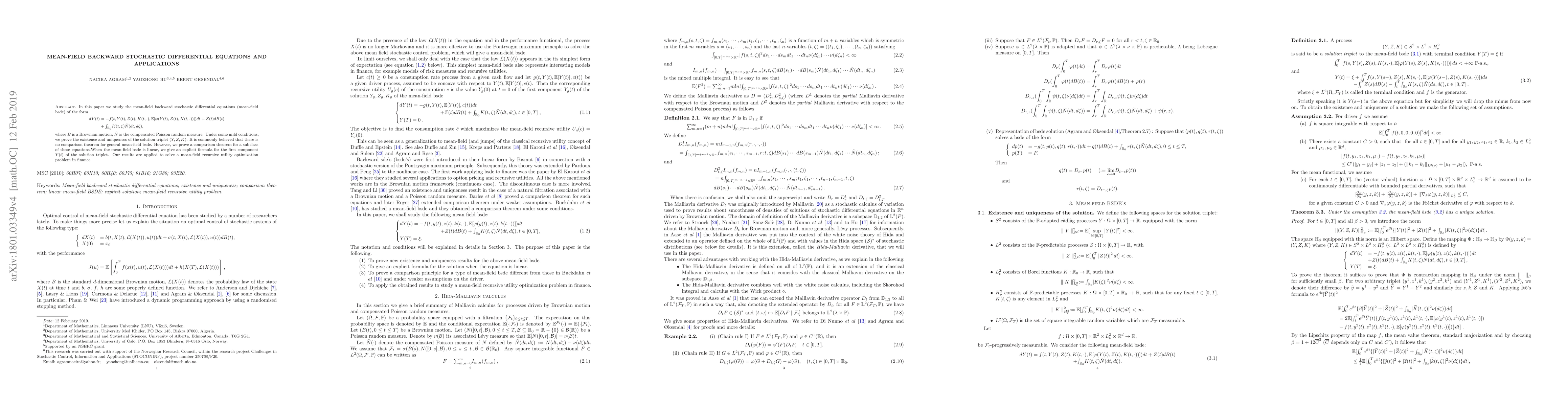 In this paper we study the mean-field backward stochastic differential equations (mean-field bsde) of the form dY(t) =-f(t,Y(t),Z(t),K(t, . ),E[\varphi(Y(t),Z(t),K(t,.))])dt+Z(t)dB(t) +\int_{R_{0}}K(t,\zeta)\tilde{N}(dt,d\zeta), where B is a Brownian motion, \tilde{N} is the compensated Poisson random measure. Under some mild conditions, we prove the existence and uniqueness of the solution triplet (Y,Z,K). It is commonly believed that there is no comparison theorem for general mean-field bsde. However, we prove a comparison theorem for a subclass of these equations. When the mean-field bsde is linear, we give an explicit formula for the first component Y(t) of the solution triplet. Our results are applied to solve a mean-field recursive utility optimization problem in finance.