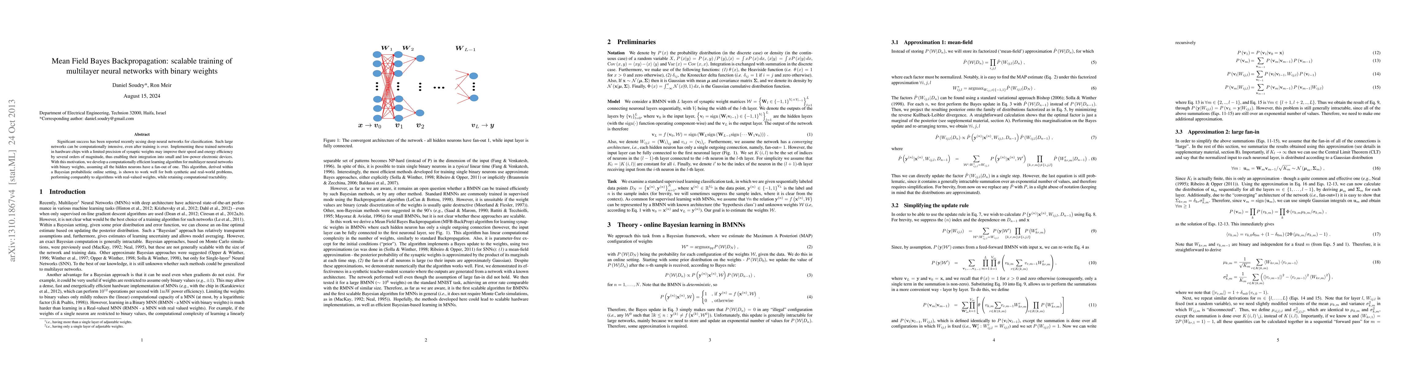 This paper introduces a scalable learning algorithm called Mean Field Bayes Backpropagation for training multilayer neural networks with binary weights, demonstrating its effectiveness for both synthetic and real-world problems. The method aims to improve the speed and energy efficiency of deep neural networks when implemented in hardware with limited precision.