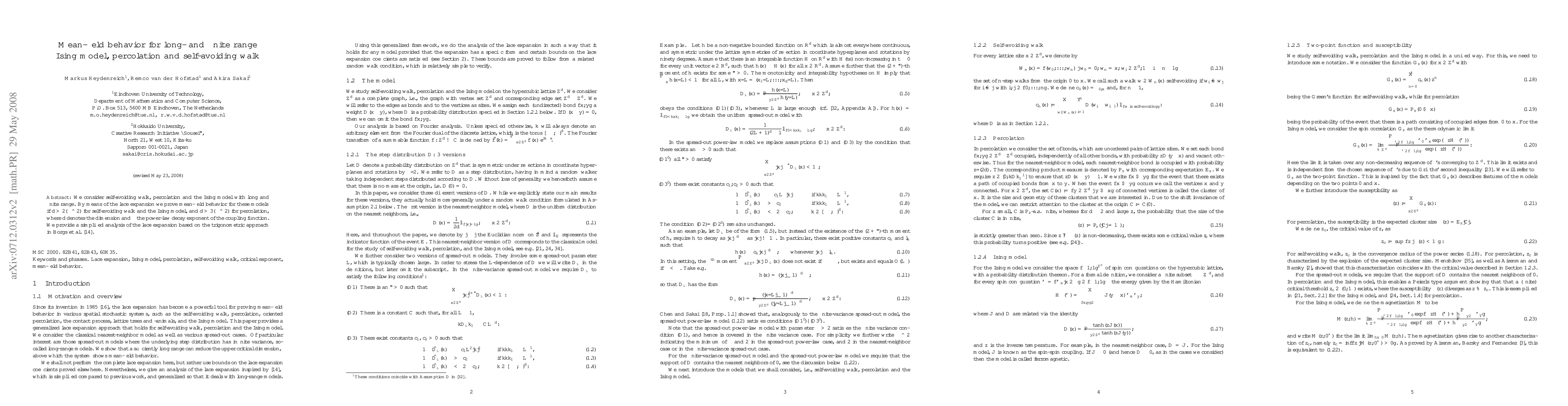 This paper proves mean-field behavior for long- and finite-range Ising models, percolation, and self-avoiding walks using the lace expansion method. The analysis shows that mean-field behavior holds for $d>2(\alpha\wedge2)$ for self-avoiding walk and the Ising model, and $d>3(\alpha\wedge2)$ for percolation, where $d$ is the dimension and $\alpha$ is the decay exponent of the coupling function.