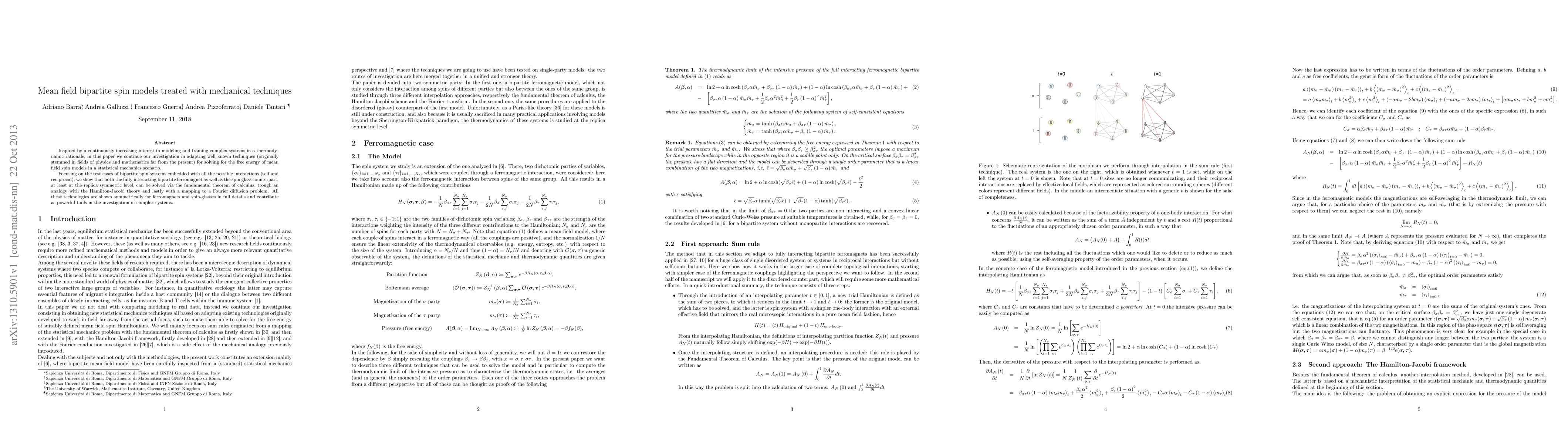 This paper explores the application of mechanical techniques to solve the free energy of mean field bipartite spin models in statistical mechanics, demonstrating that both ferromagnets and spin glasses can be addressed using the fundamental theorem of calculus, Hamilton-Jacobi theory, and Fourier diffusion problems. These methods provide powerful tools for investigating complex systems.
