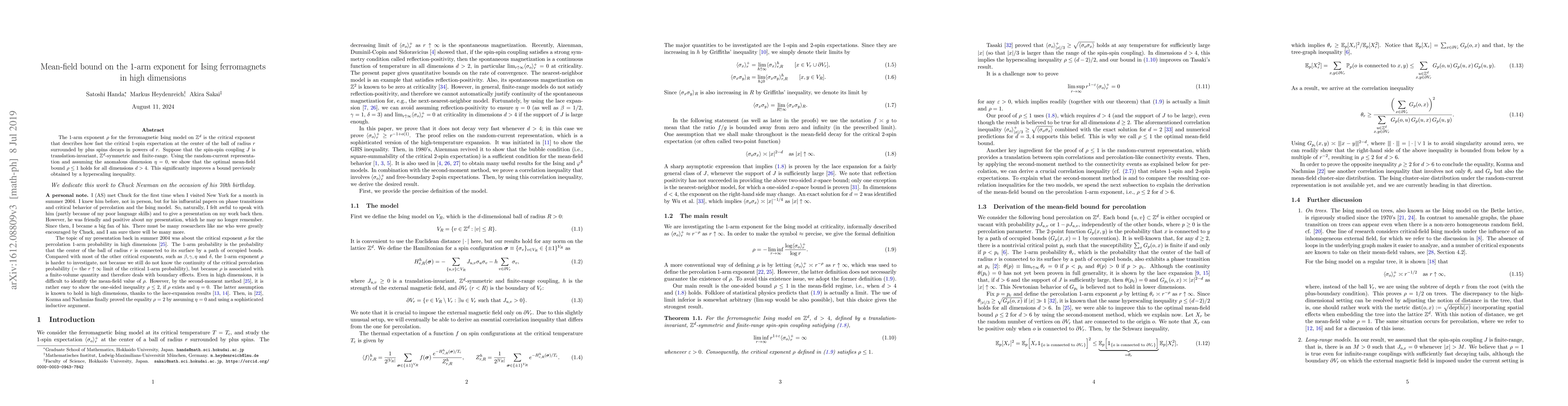 This research paper presents a mean-field bound for the 1-arm exponent u201c hou201d in ferromagnetic Ising models on u211d^d, demonstrating u201c ho u2329 u201d u2264 1 for dimensions d > 4. This bound, derived using the random-current representation and assuming u201canomalous dimension u211d = 0u201d, significantly enhances previous hyperscaling inequality-based bounds.