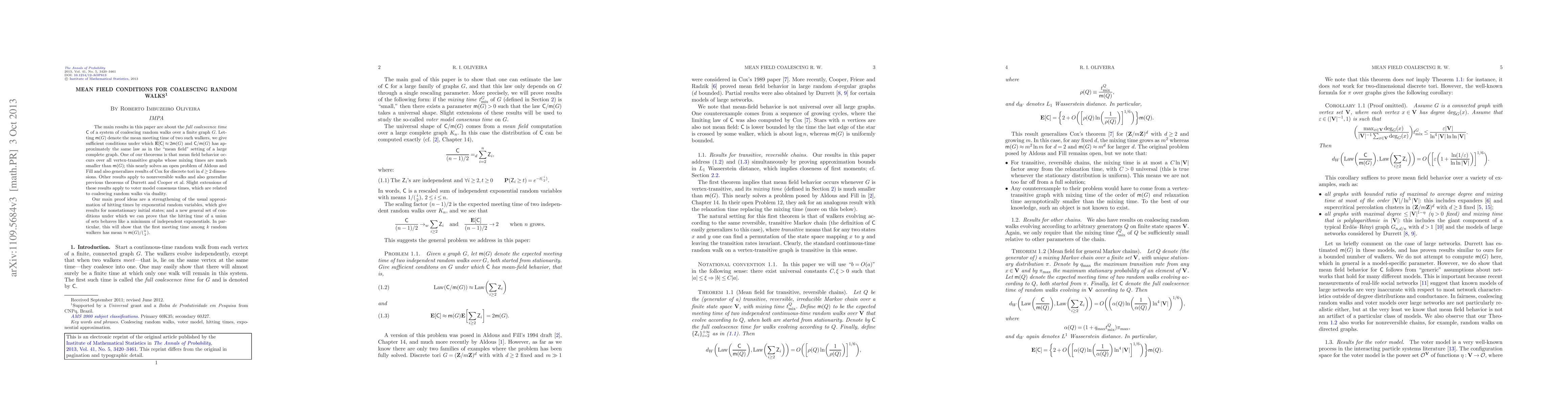 This paper investigates the coalescence time of random walks on finite graphs, providing sufficient conditions for mean field behavior where the expected coalescence time approximates twice the mean meeting time. It resolves an open problem regarding vertex-transitive graphs and extends results to nonreversible walks and voter model consensus times.
