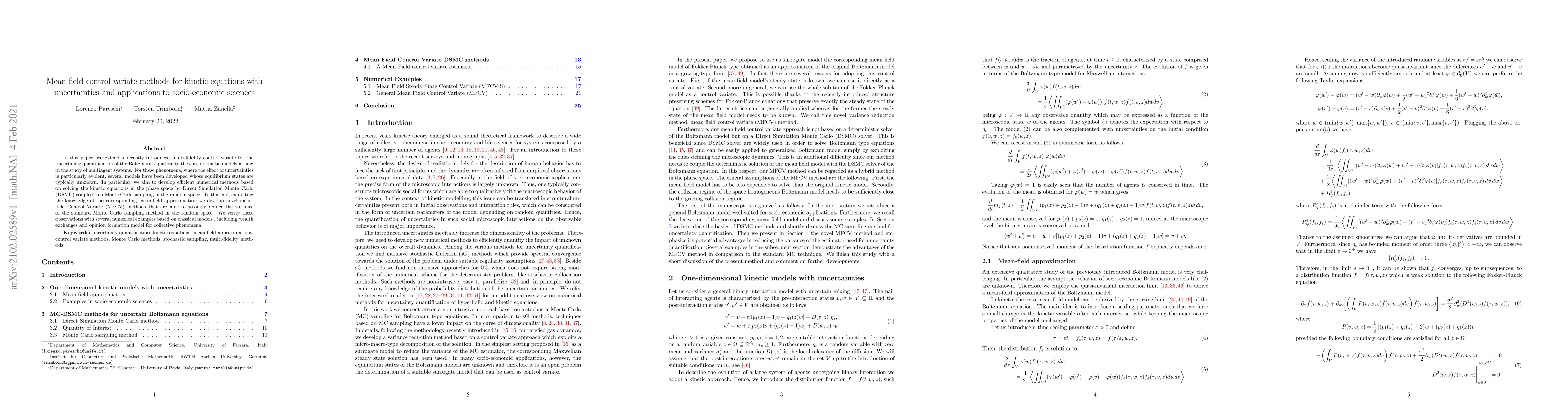 This paper introduces mean-field control variate methods for kinetic equations with uncertainties, extending multi-fidelity techniques to multiagent systems. The authors develop novel MFCV methods to reduce variance in Monte Carlo sampling, validated through numerical examples in socio-economic sciences like wealth exchanges and opinion formation.
