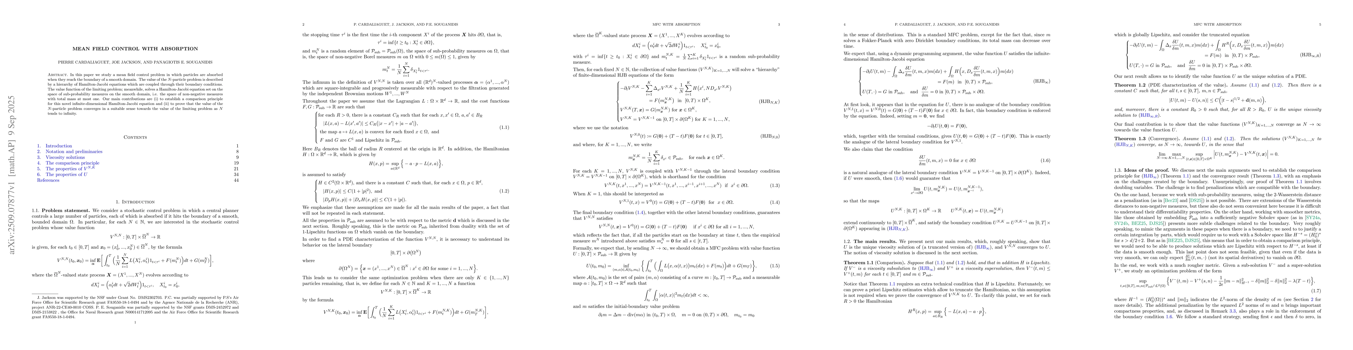 In this paper we study a mean field control problem in which particles are absorbed when they reach the boundary of a smooth domain. The value of the N-particle problem is described by a hierarchy of Hamilton-Jacobi equations which are coupled through their boundary conditions. The value function of the limiting problem; meanwhile, solves a Hamilton-Jacobi equation set on the space of sub-probability measures on the smooth domain, i.e. the space of non-negative measures with total mass at most one. Our main contributions are (i) to establish a comparison principle for this novel infinite-dimensional Hamilton-Jacobi equation and (ii) to prove that the value of the N-particle problem converges in a suitable sense towards the value of the limiting problem as N tends to infinity.
