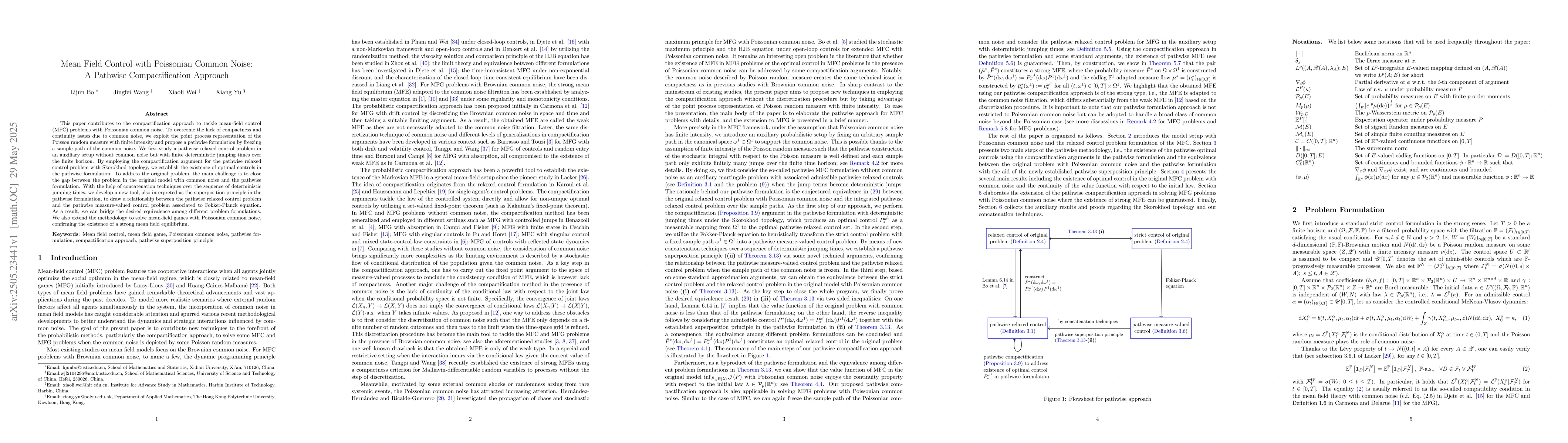 The paper introduces a pathwise compactification approach, utilizing a superposition principle to establish the existence of optimal controls in MFC problems with Poissonian common noise, and extends this to mean-field games.