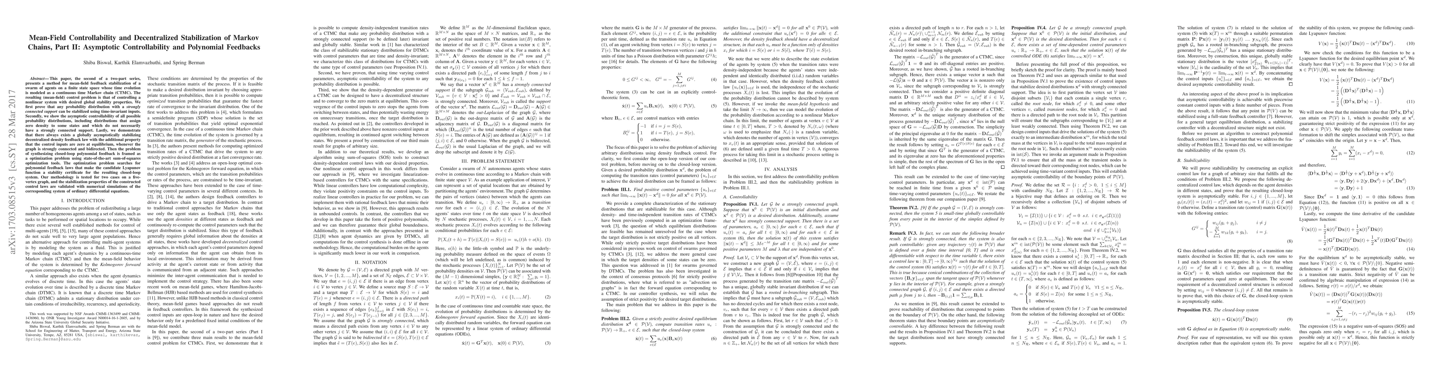 This paper, the second of a two-part series, presents a method for mean-field feedback stabilization of a swarm of agents on a finite state space whose time evolution is modeled as a continuous time Markov chain (CTMC). The resulting (mean-field) control problem is that of controlling a nonlinear system with desired global stability properties. We first prove that any probability distribution with a strongly connected support can be stabilized using time-invariant inputs. Secondly, we show the asymptotic controllability of all possible probability distributions, including distributions that assign zero density to some states and which do not necessarily have a strongly connected support. Lastly, we demonstrate that there always exists a globally asymptotically stabilizing decentralized density feedback law with the additional property that the control inputs are zero at equilibrium, whenever the graph is strongly connected and bidirected. Then the problem of synthesizing closed-loop polynomial feedback is framed as a optimization problem using state-of-the-art sum-of-squares optimization tools. The optimization problem searches for polynomial feedback laws that make the candidate Lyapunov function a stability certificate for the resulting closed-loop system. Our methodology is tested for two cases on a five vertex graph, and the stabilization properties of the constructed control laws are validated with numerical simulations of the corresponding system of ordinary differential equations.