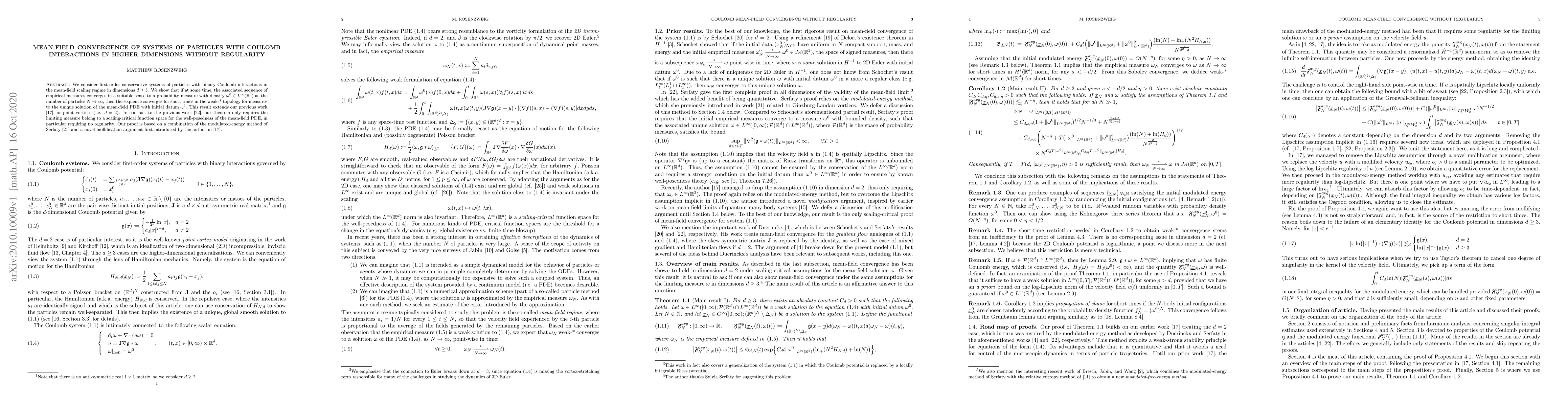 We consider first-order conservative systems of particles with binary Coulomb interactions in the mean-field scaling regime in dimensions $d\geq 3$. We show that if at some time, the associated sequence of empirical measures converges in a suitable sense to a probability measure with bounded density $\omega^0$ as the number of particles $N\rightarrow\infty$, then the sequence converges for short times in the weak-* topology for measures to the unique solution of the mean-field PDE with initial datum $\omega^0$. This result extends our previous work arXiv:2004.04140 for point vortices (i.e. $d=2$). In contrast to the previous work arXiv:1803.08345, our theorem only requires the limiting measure belong to a scaling-critical function space for the well-posedness of the mean-field PDE, in particular requiring no regularity. Our proof is based on a combination of the modulated-energy method of Serfaty and a novel mollification argument first introduced by the author in arXiv:2004.04140.