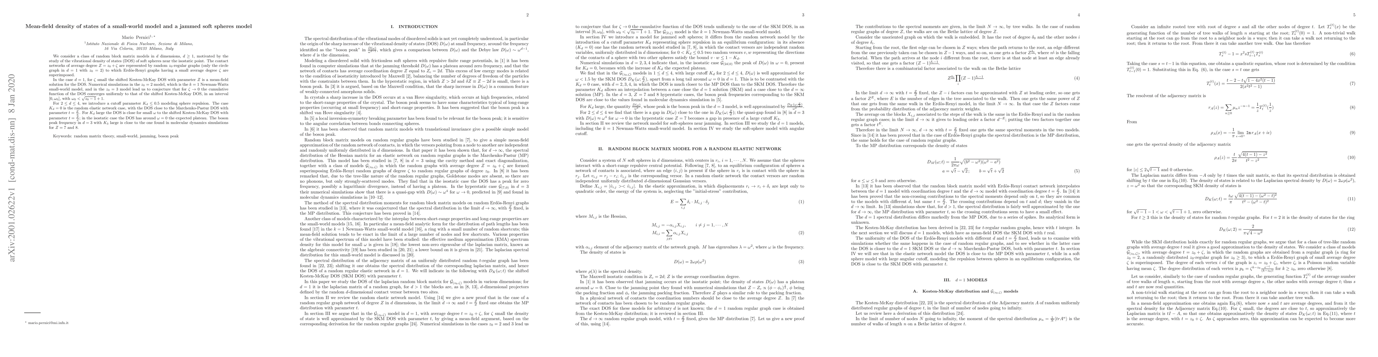We consider a class of random block matrix models in $d$ dimensions, $d \ge 1$, motivated by the study of the vibrational density of states (DOS) of soft spheres near the isostatic point. The contact networks of average degree $Z = z_0 + \zeta$ are represented by random $z_0$-regular graphs (only the circle graph in $d=1$ with $z_0=2$) to which Erd\"os-Renyi graphs having a small average degree $\zeta$ are superimposed. In the case $d=1$, for $\zeta$ small the shifted Kesten-McKay DOS with parameter $Z$ is a mean-field solution for the DOS. Numerical simulations in the $z_0=2$ model, which is the $k=1$ Newman-Watts small-world model, and in the $z_0=3$ model lead us to conjecture that for $\zeta \to 0$ the cumulative function of the DOS converges uniformly to that of the shifted Kesten-McKay DOS, in an interval $[0, \omega_0]$, with $\omega_0 < \sqrt{z_0-1} + 1$. For $2 \le d \le 4$, we introduce a cutoff parameter $K_d \le 0.5$ modeling sphere repulsion. The case $K_d=0$ is the random elastic network case, with the DOS close to the Marchenko-Pastur DOS with parameter $t=\frac{Z}{d}$. For $K_d$ large the DOS is close for small $\omega$ to the shifted Kesten-McKay DOS with parameter $t=\frac{Z}{d}$; in the isostatic case the DOS has around $\omega=0$ the expected plateau. The boson peak frequency in $d=3$ with $K_3$ large is close to the one found in molecular dynamics simulations for $Z=7$ and $8$.