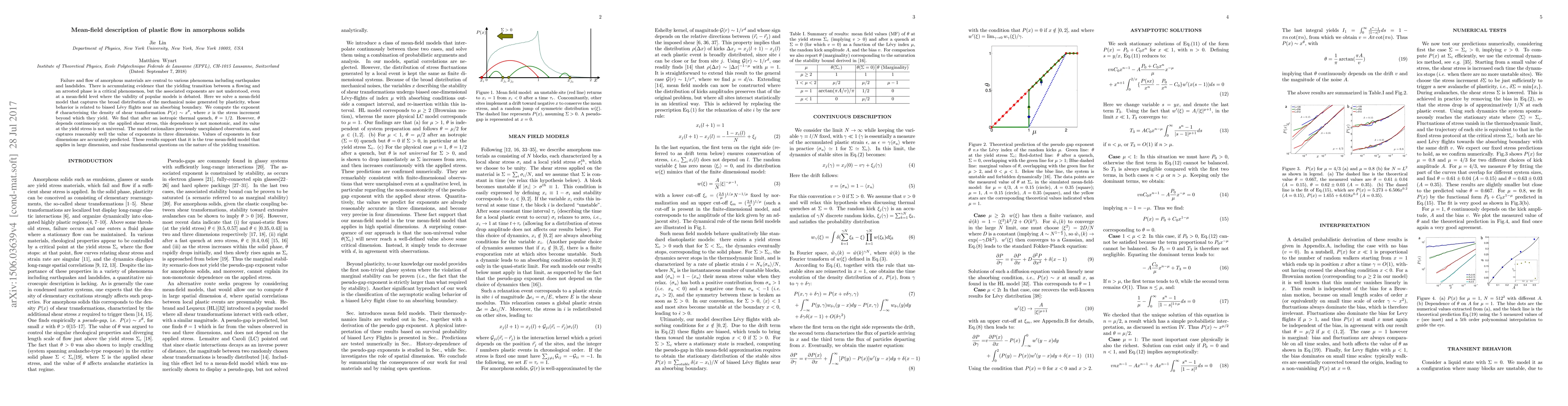 Failure and flow of amorphous materials are central to various phenomena including earthquakes and landslides. There is accumulating evidence that the yielding transition between a flowing and an arrested phase is a critical phenomenon, but the associated exponents are not understood, even at a mean-field level where the validity of popular models is debated. Here we solve a mean-field model that captures the broad distribution of the mechanical noise generated by plasticity, whose behavior is related to biased L\'evy flights near an absorbing boundary. We compute the exponent $\theta$ characterising the density of shear transformation $P(x)\sim x^{\theta}$, where $x$ is the stress increment beyond which they yield. We find that after an isotropic thermal quench, $\theta=1/2$. However, $\theta$ depends continuously on the applied shear stress, this dependence is not monotonic, and its value at the yield stress is not universal. The model rationalizes previously unexplained observations, and captures reasonably well the value of exponents in three dimensions. Values of exponents in four dimensions are accurately predicted. These results support that it is the true mean-field model that applies in large dimension, and raise fundamental questions on the nature of the yielding transition.