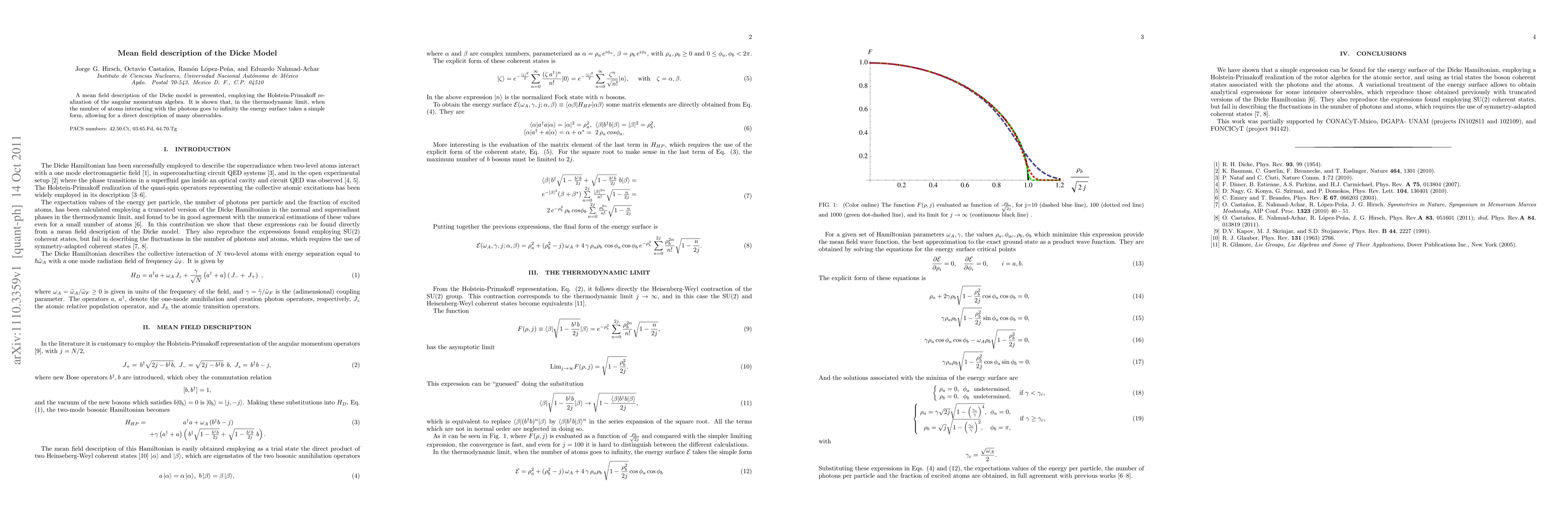 A mean field description of the Dicke model is presented, employing the Holstein-Primakoff realization of the angular momentum algebra. It is shown that, in the thermodynamic limit, when the number of atoms interacting with the photons goes to infinity the energy surface takes a simple form, allowing for a direct description of many observables.
