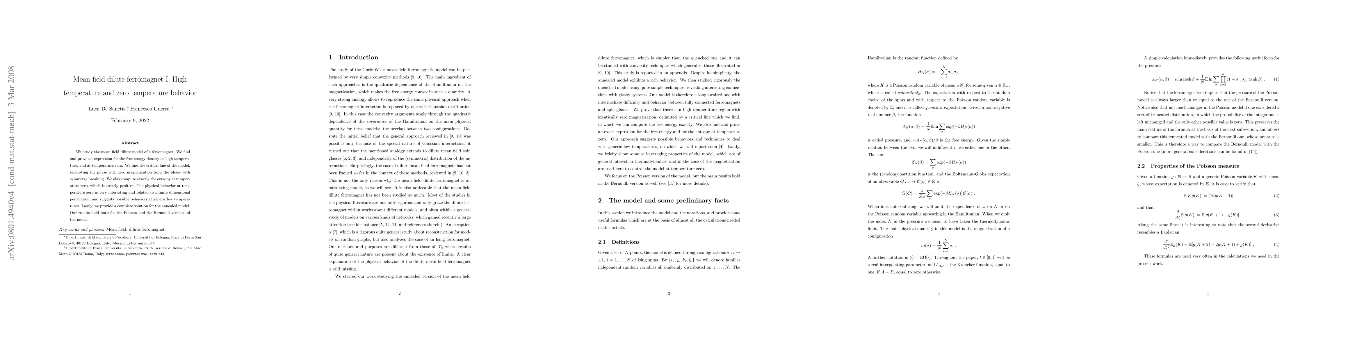 This research paper investigates a ferromagnet model at high temperature and zero temperature, finding expressions for free energy density, a critical line separating phases with magnetization, and strictly positive entropy at zero temperature.