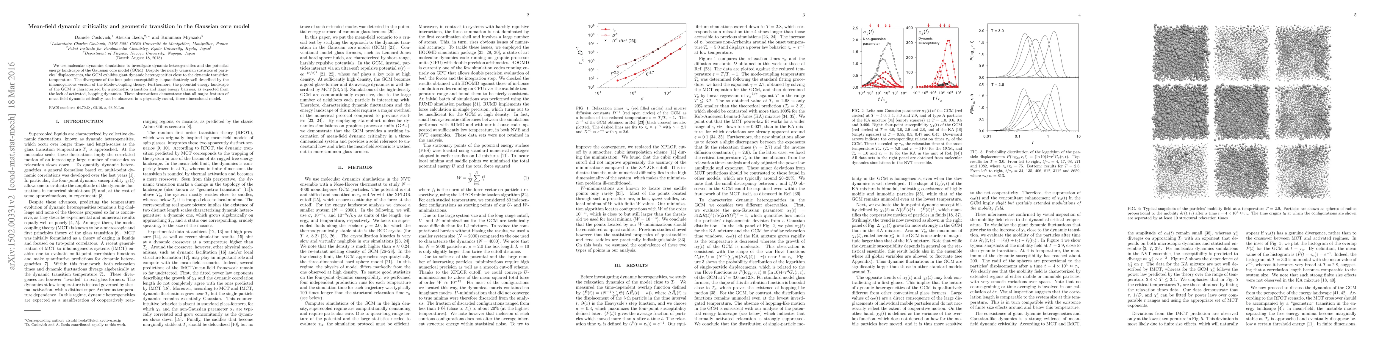 Researchers used molecular dynamics simulations to study dynamic heterogeneities in the Gaussian core model, finding giant fluctuations near a critical temperature that align with Mode-Coupling theory predictions. The model's potential energy landscape exhibits a geometric transition with large energy barriers, demonstrating key features of mean-field dynamic criticality.
