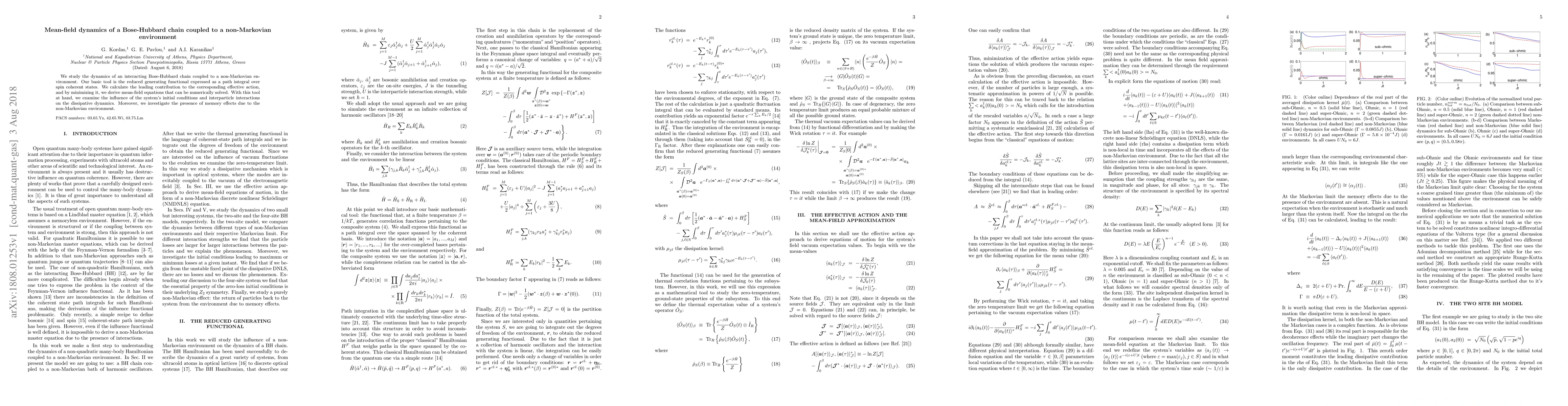 We study the dynamics of an interacting Bose-Hubbard chain coupled to a non-Markovian environment. Our basic tool is the reduced generating functional expressed as a path integral over spin-coherent states. We calculate the leading contribution to the corresponding effective action, and by minimizing it, we derive mean-field equations that can be numerically solved. With this tool at hand, we examine the influence of the system's initial conditions and interparticle interactions on the dissipative dynamics. Moreover, we investigate the presence of memory effects due to the non-Markovian environment.