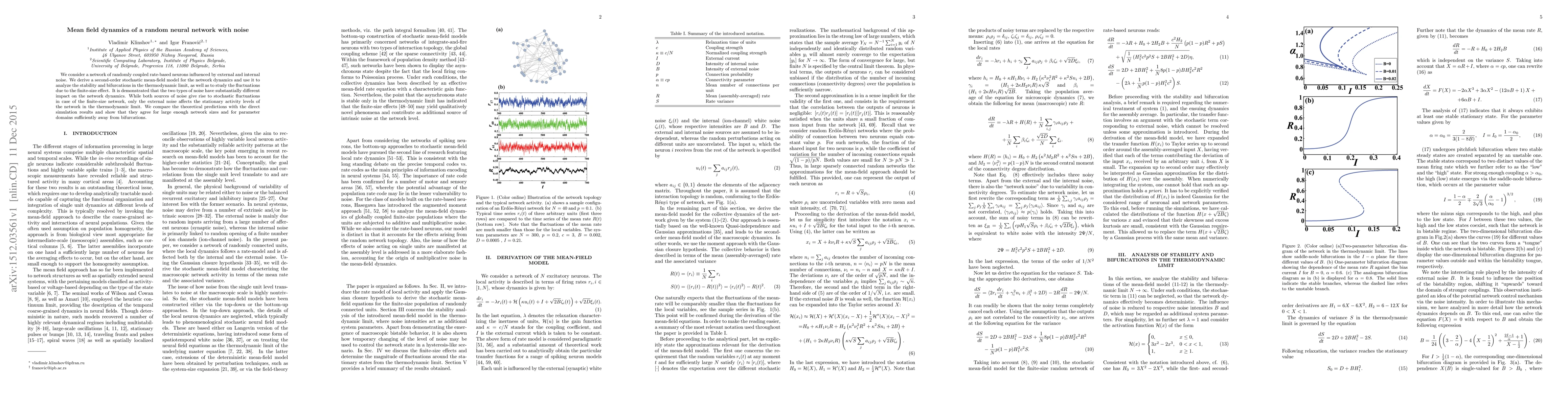 This paper develops a second-order stochastic mean-field model for a network of randomly coupled neurons with both external and internal noise, analyzing their impact on network dynamics, stability, and bifurcations. It finds that while both noise types cause fluctuations, only external noise affects stationary activity levels in the thermodynamic limit.