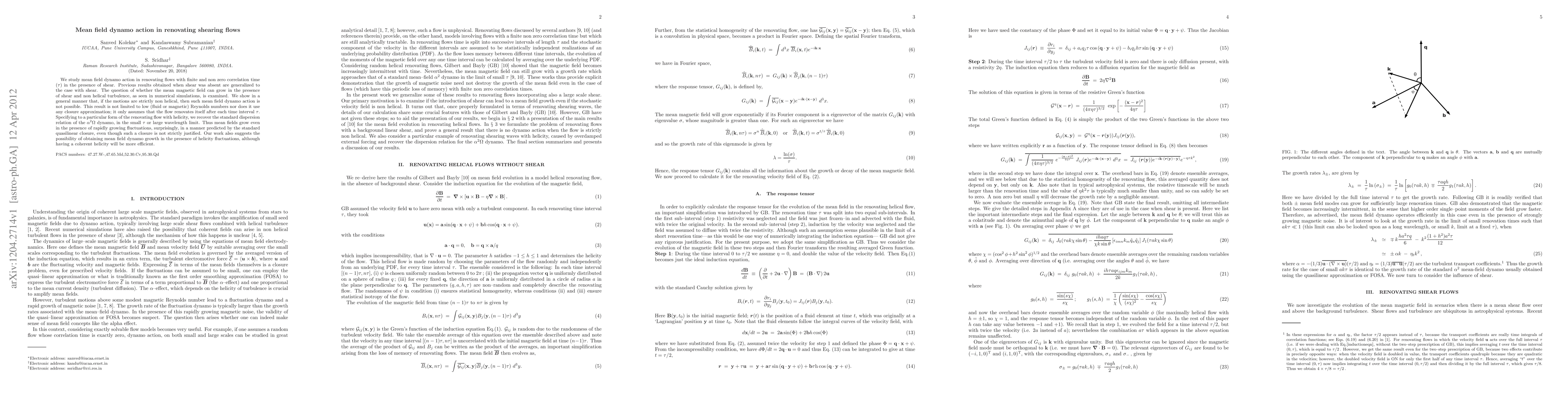 This paper explores mean field dynamo action in renovating shearing flows with finite correlation time and non-helical turbulence, demonstrating that strictly non-helical motions prevent such dynamo action. However, with helicity, mean fields can still grow under standard quasilinear closure predictions, despite its lack of strict justification.