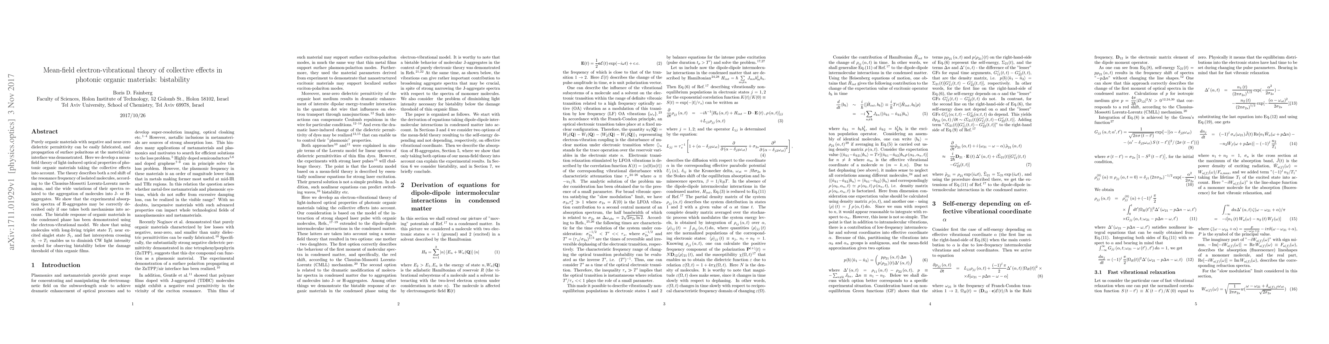 This paper develops a mean-field theory to describe the optical properties of photonic organic materials, accounting for collective effects and explaining the red shift and spectral variations due to molecular aggregation. The study also demonstrates bistable optical responses in organic materials using molecules with long-lived triplet states, reducing the light intensity required for bistability below the damage threshold.