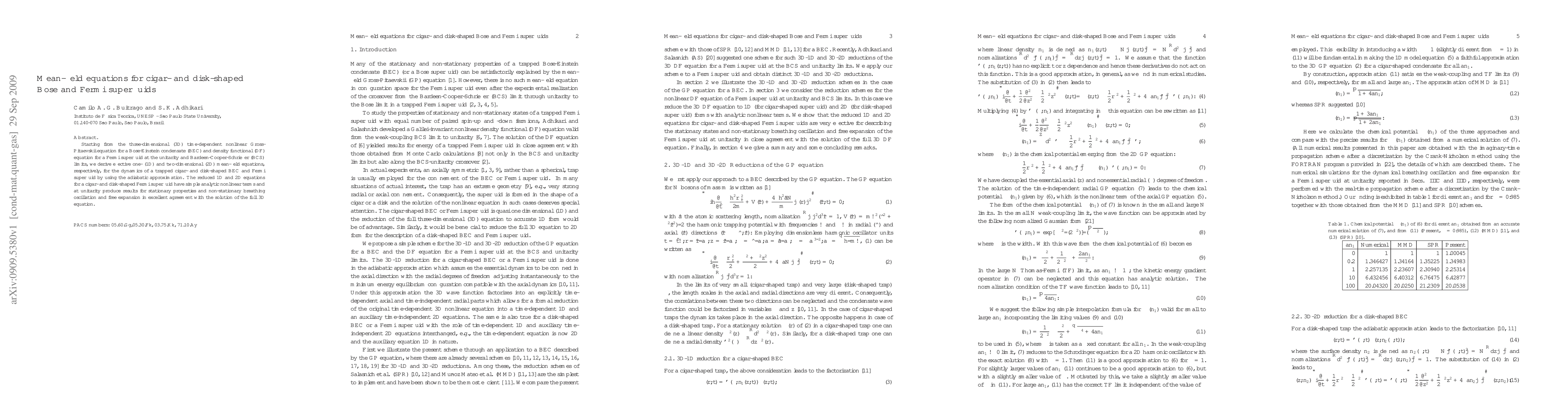Starting from the three-dimensional (3D) time-dependent nonlinear Gross-Pitaevskii equation for a Bose-Einstein condensate (BEC) and density functional (DF) equation for a Fermi superfluid at the unitarity and Bardeen-Cooper-Schrieffer (BCS) limits, we derive effective one- (1D) and two-dimensional (2D) mean-field equations, respectively, for the dynamics of a trapped cigar- and disk-shaped BEC and Fermi superfluid by using the adiabatic approximation. The reduced 1D and 2D equations for a cigar- and disk-shaped Fermi superfluid have simple analytic nonlinear terms and at unitarity produce results for stationary properties and non-stationary breathing oscillation and free expansion in excellent agreement with the solution of the full 3D equation.