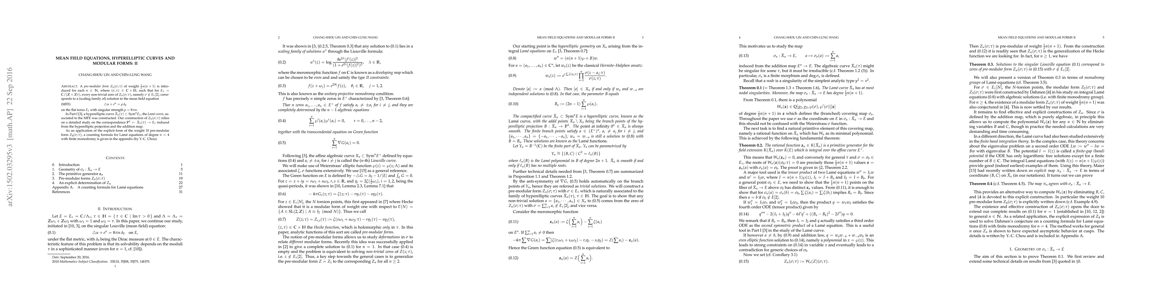 A pre-modular form $Z_n(\sigma; \tau)$ of weight $\tfrac{1}{2} n(n + 1)$ is introduced for each $n \in \Bbb N$, where $(\sigma, \tau) \in \Bbb C \times \Bbb H$, such that for $E_\tau = \Bbb C/(\Bbb Z + \Bbb Z \tau)$, every non-trivial zero of $Z_n(\sigma; \tau)$, namely $\sigma \not\in E_\tau[2]$, corresponds to a (scaling family of) solution to the mean field equation \begin{equation} \tag{MFE} \triangle u + e^u = \rho \, \delta_0 \end{equation} on the flat torus $E_\tau$ with singular strength $\rho = 8\pi n$. In Part I (Cambridge J. Math. 3, 2015), a hyperelliptic curve $\bar X_n(\tau) \subset {\rm Sym}^n E_\tau$, the Lam\'e curve, associated to the MFE was constructed. Our construction of $Z_n(\sigma; \tau)$ relies on a detailed study on the correspondence $\Bbb P^1 \leftarrow \bar X_n(\tau) \to E_\tau$ induced from the hyperelliptic projection and the addition map. As an application of the explicit form of the weight 10 pre-modular form $Z_4(\sigma; \tau)$, a counting formula for Lam\'e equations of degree $n = 4$ with finite monodromy is given in the appendix (by Y.-C. Chou).