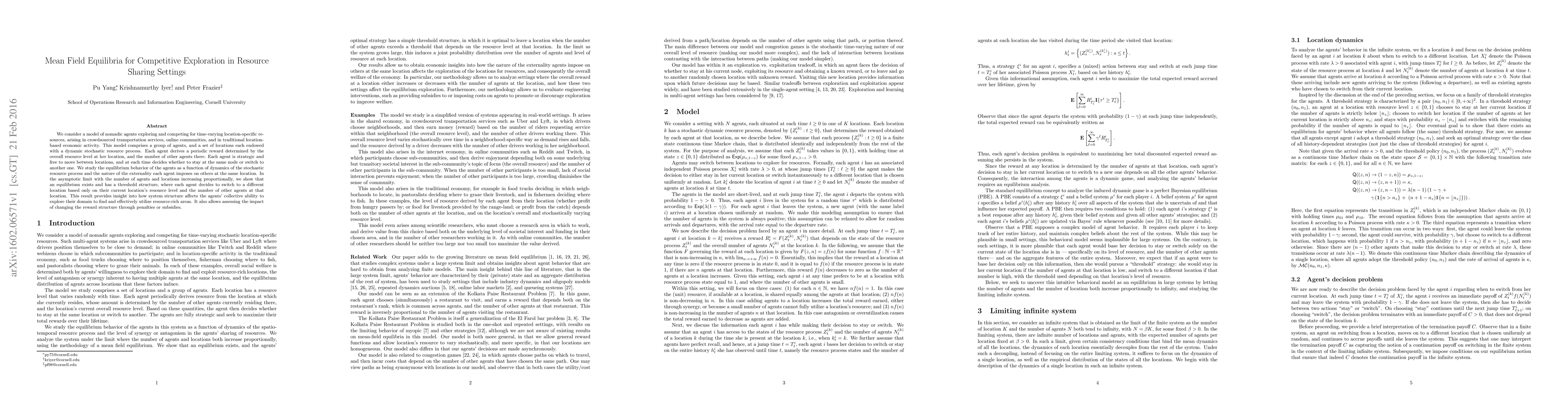 This paper models nomadic agents competing for dynamic resources in various locations, showing that in large systems, an equilibrium emerges where agents switch locations based on current resource levels and agent density, providing insights into resource exploration and reward structure impacts.