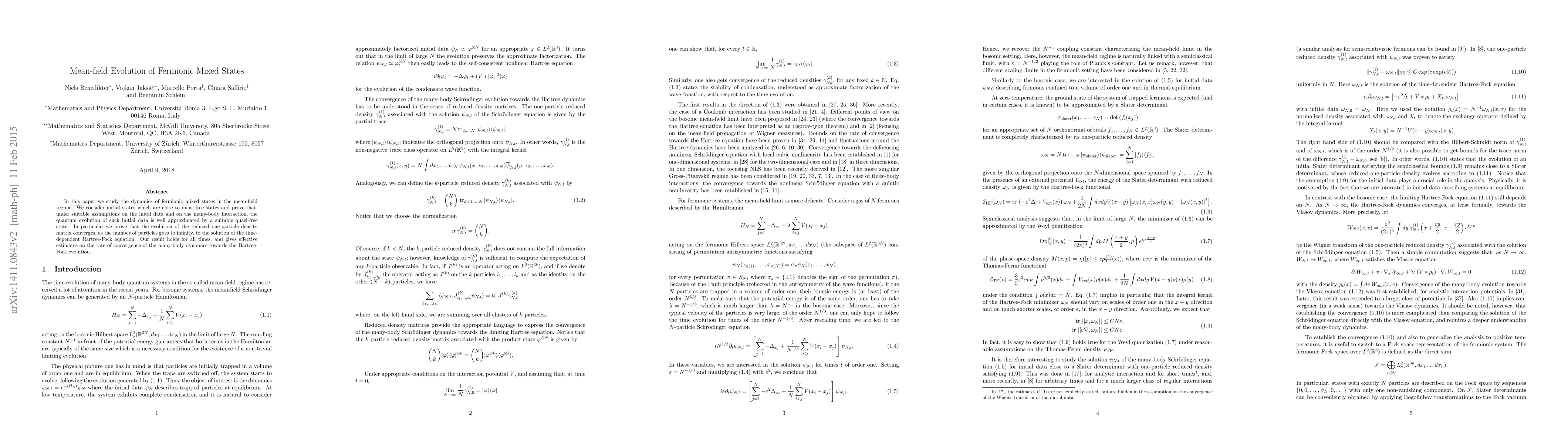 In this paper we study the dynamics of fermionic mixed states in the mean-field regime. We consider initial states which are close to quasi-free states and prove that, under suitable assumptions on the inital data and on the many-body interaction, the quantum evolution of such initial data is well approximated by a suitable quasi-free state. In particular we prove that the evolution of the reduced one-particle density matrix converges, as the number of particles goes to infinity, to the solution of the time-dependent Hartree-Fock equation. Our result holds for all times, and gives effective estimates on the rate of convergence of the many-body dynamics towards the Hartree-Fock one.