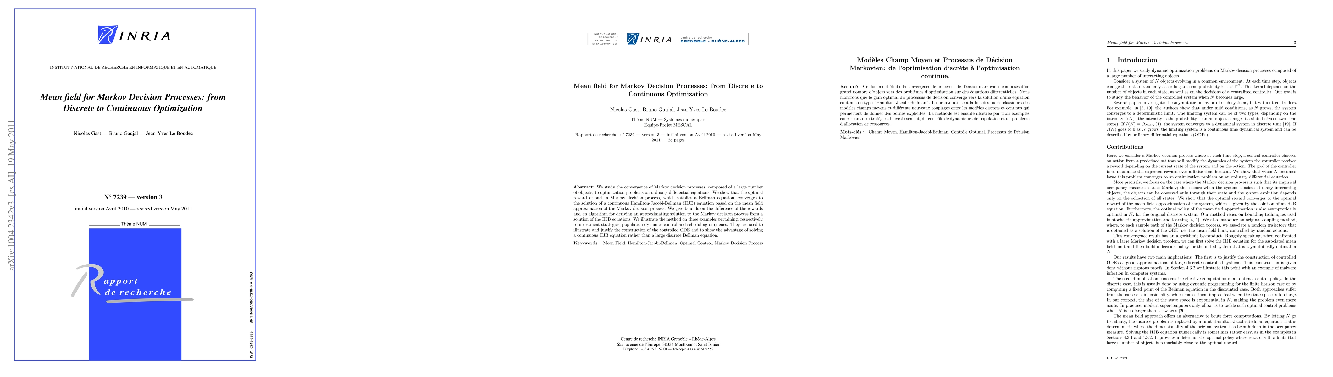 This paper investigates the convergence of large-scale Markov Decision Processes (MDPs) to continuous optimization problems governed by ordinary differential equations (ODEs). It demonstrates that the optimal reward of such MDPs converges to the solution of a continuous Hamilton-Jacobi-Bellman (HJB) equation derived via mean field approximation, providing bounds on reward differences and a constructive algorithm for the transition.
