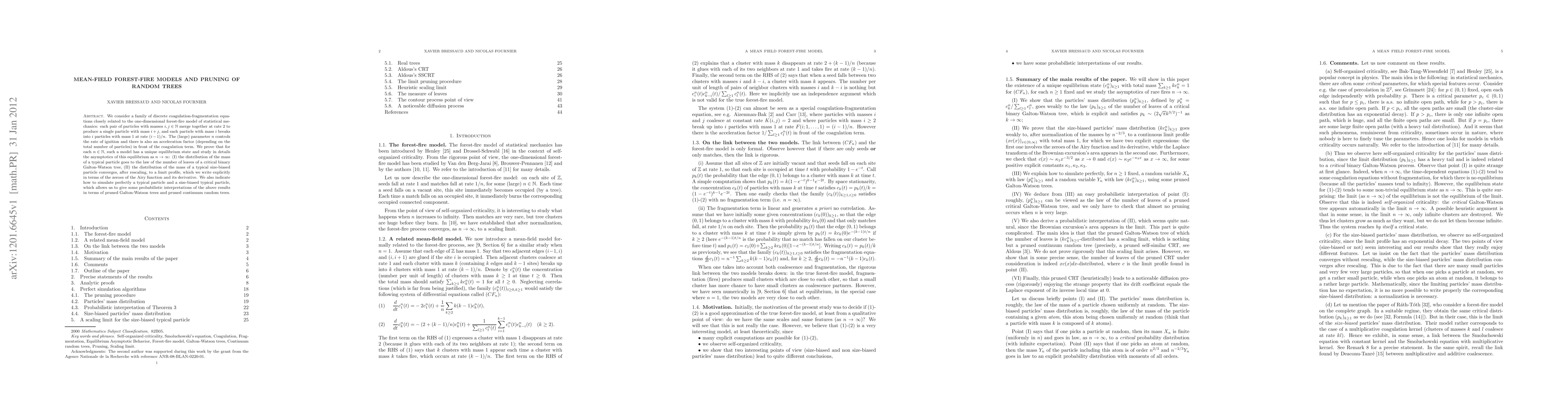 We consider a family of discrete coagulation-fragmentation equations closely related to the one-dimensional forest-fire model of statistical mechanics: each pair of particles with masses $i,j \in \nn$ merge together at rate 2 to produce a single particle with mass $i+j$, and each particle with mass $i$ breaks into $i$ particles with mass 1 at rate $(i-1)/n$. The (large) parameter $n$ controls the rate of ignition and there is also an acceleration factor (depending on the total number of particles) in front of the coagulation term. We prove that for each $n\in \nn$, such a model has a unique equilibrium state and study in details the asymptotics of this equilibrium as $n\to \infty$: (I) the distribution of the mass of a typical particle goes to the law of the number of leaves of a critical binary Galton-Watson tree, (II) the distribution of the mass of a typical size-biased particle converges, after rescaling, to a limit profile, which we write explicitly in terms of the zeroes of the Airy function and its derivative. We also indicate how to simulate perfectly a typical particle and a size-biased typical particle, which allows us to give some probabilistic interpretations of the above results in terms of pruned Galton-Watson trees and pruned continuum random trees.
