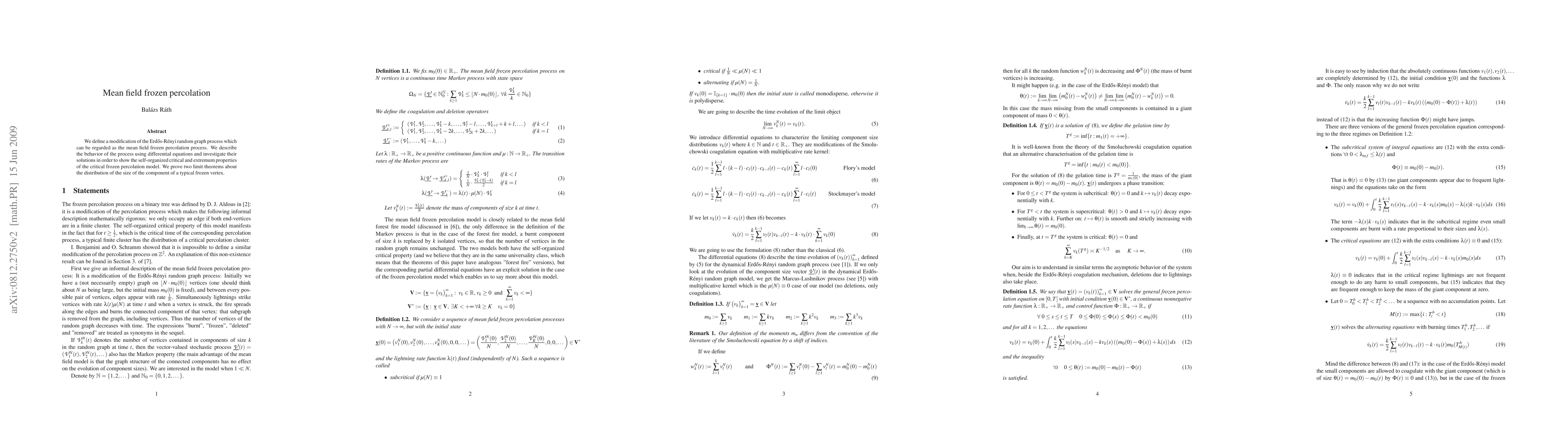 We define a modification of the Erdos-Renyi random graph process which can be regarded as the mean field frozen percolation process. We describe the behavior of the process using differential equations and investigate their solutions in order to show the self-organized critical and extremum properties of the critical frozen percolation model. We prove two limit theorems about the distribution of the size of the component of a typical frozen vertex.