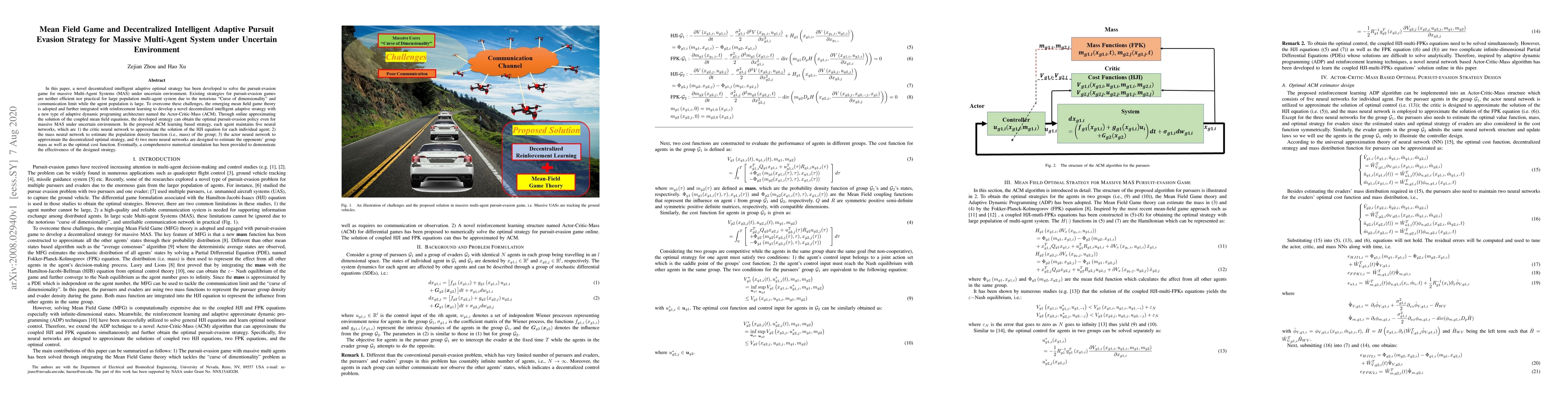 This paper introduces a novel decentralized intelligent adaptive strategy using mean field game theory and reinforcement learning to solve pursuit-evasion games for massive multi-agent systems under uncertain conditions. The proposed Actor-Critic-Mass (ACM) architecture enables each agent to maintain five neural networks for optimal policy approximation, overcoming the "Curse of dimensionality" and communication limitations.