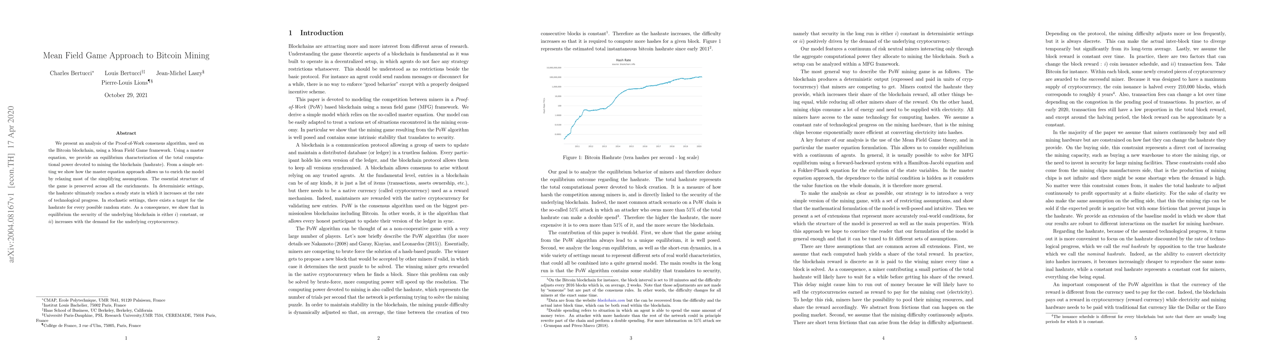 The paper uses a Mean Field Game framework to analyze Bitcoin mining and find that the total computational power (hashrate) reaches a steady state in equilibrium, with security either remaining constant or increasing with demand for the cryptocurrency.