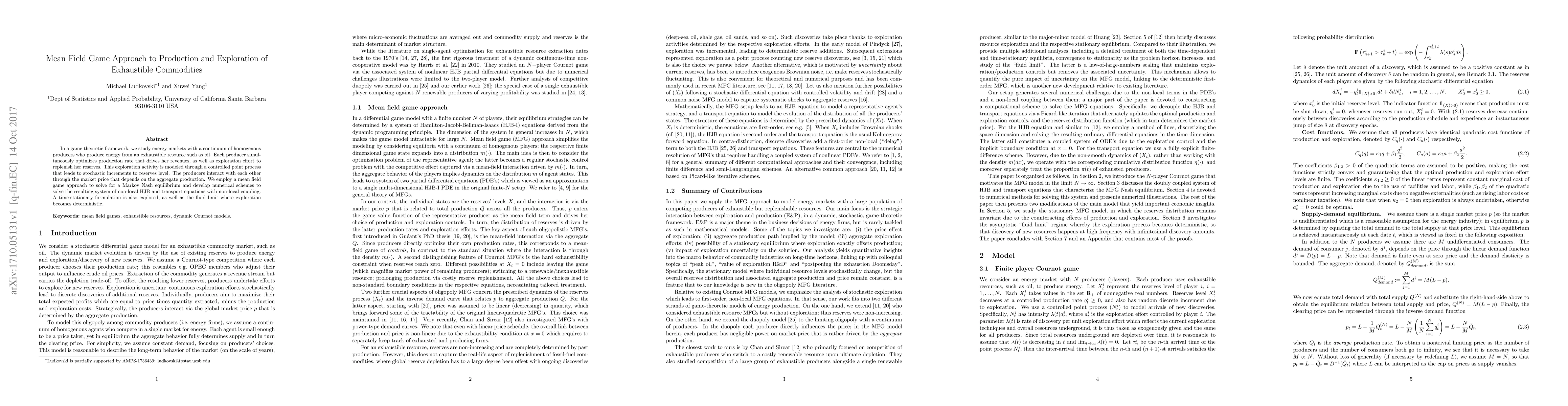 This paper uses game theory to study energy markets with producers competing for an exhaustible resource like oil, exploring optimal production rates and exploration efforts. It solves the complex interactions between producers using a mean field game approach and develops numerical schemes to analyze equilibrium scenarios.