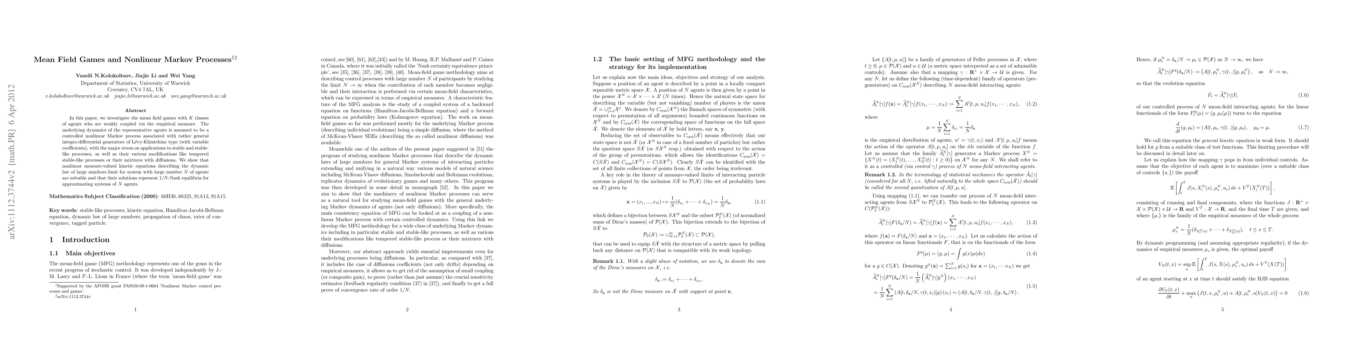In this paper, we investigate the mean field games with $K$ classes of agents who are weakly coupled via the empirical measure. The underlying dynamics of the representative agents is assumed to be a controlled nonlinear Markov process associated with rather general integro-differential generators of L\'evy-Khintchine type (with variable coefficients). We show that nonlinear measure-valued kinetic equations describing the dynamic law of large numbers limit for system with large number N of agents are solvable and that their solutions represent 1/N-Nash equilibria for approximating systems of N agents.