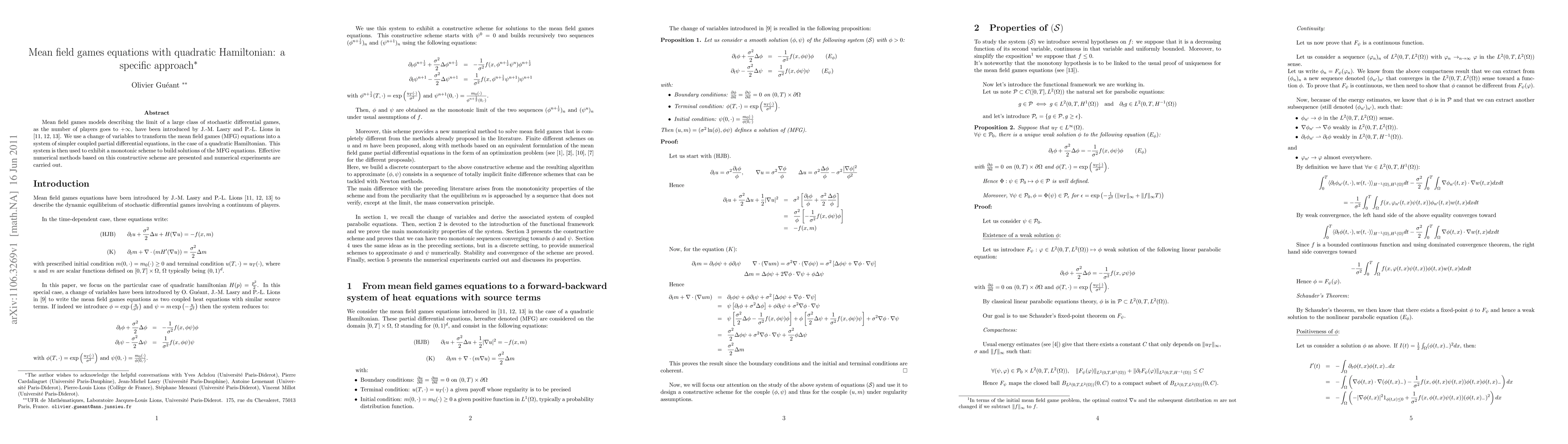 Summary: The paper introduces a method to transform mean field games equations with quadratic Hamiltonian into simpler coupled partial differential equations, using a monotonic scheme to construct solutions. Effective numerical methods are developed based on this scheme, along with numerical experiments validating the approach.