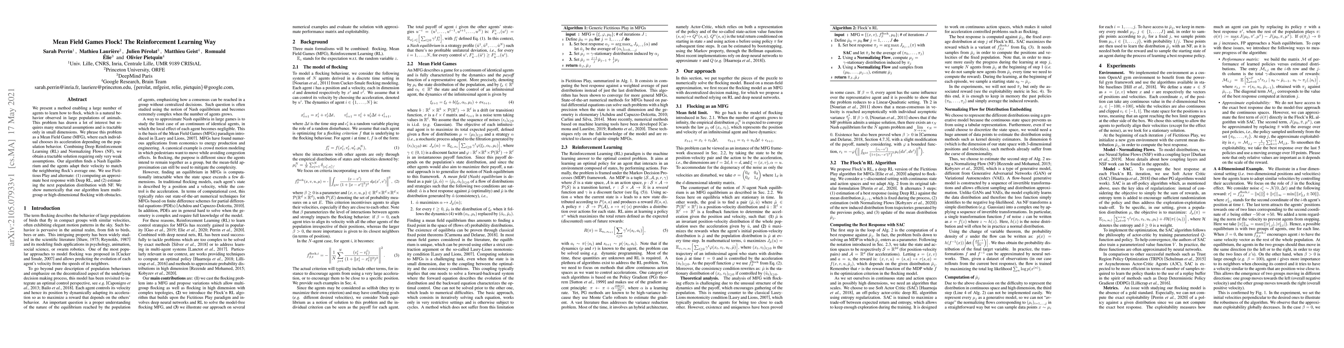 We present a method enabling a large number of agents to learn how to flock, which is a natural behavior observed in large populations of animals. This problem has drawn a lot of interest but requires many structural assumptions and is tractable only in small dimensions. We phrase this problem as a Mean Field Game (MFG), where each individual chooses its acceleration depending on the population behavior. Combining Deep Reinforcement Learning (RL) and Normalizing Flows (NF), we obtain a tractable solution requiring only very weak assumptions. Our algorithm finds a Nash Equilibrium and the agents adapt their velocity to match the neighboring flock's average one. We use Fictitious Play and alternate: (1) computing an approximate best response with Deep RL, and (2) estimating the next population distribution with NF. We show numerically that our algorithm learn multi-group or high-dimensional flocking with obstacles.