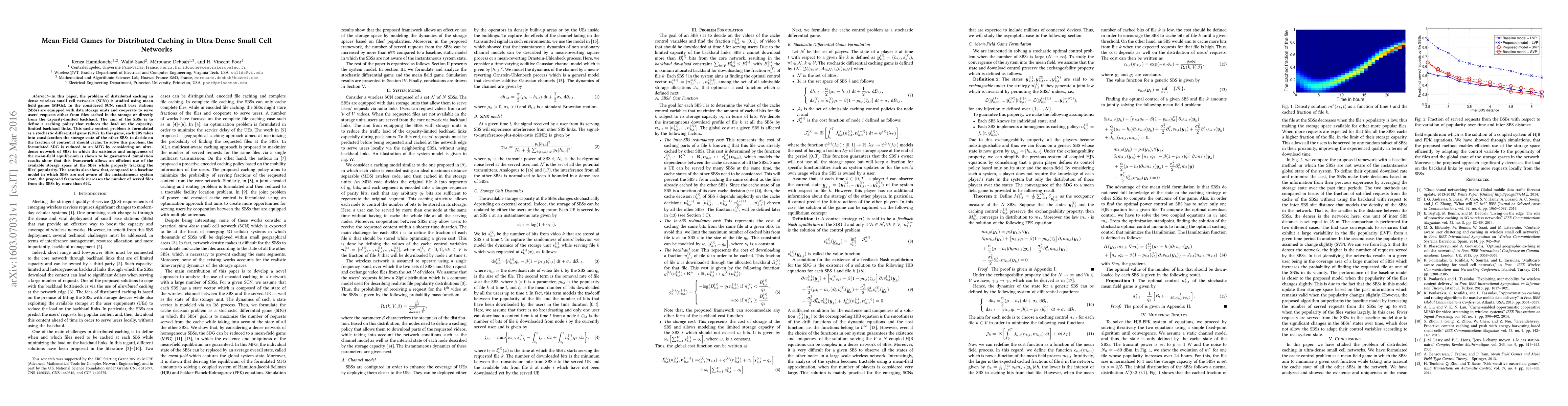 This paper studies distributed caching in ultra-dense small cell networks using mean-field games, formulating the cache control problem as a stochastic differential game. The proposed framework efficiently utilizes SBS storage and increases served files by over 69% compared to a baseline model.