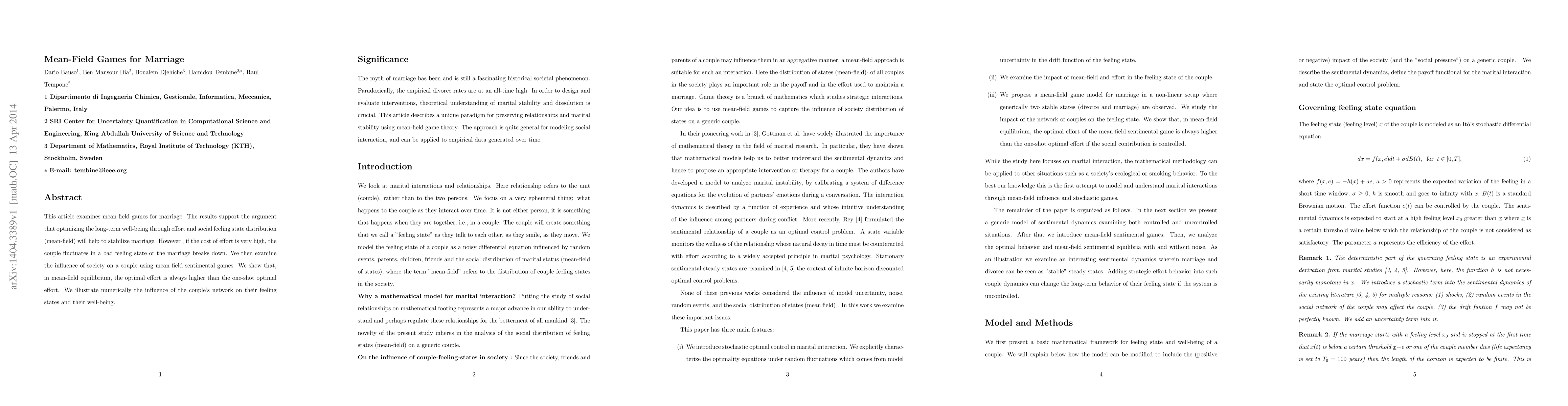 This paper explores mean-field games applied to marriage dynamics, demonstrating that optimizing effort and social feeling state distribution can stabilize relationships but high effort costs can lead to breakdowns. It also shows that societal influences and couple networks affect optimal effort levels, which are higher in mean-field equilibrium than in one-shot scenarios.