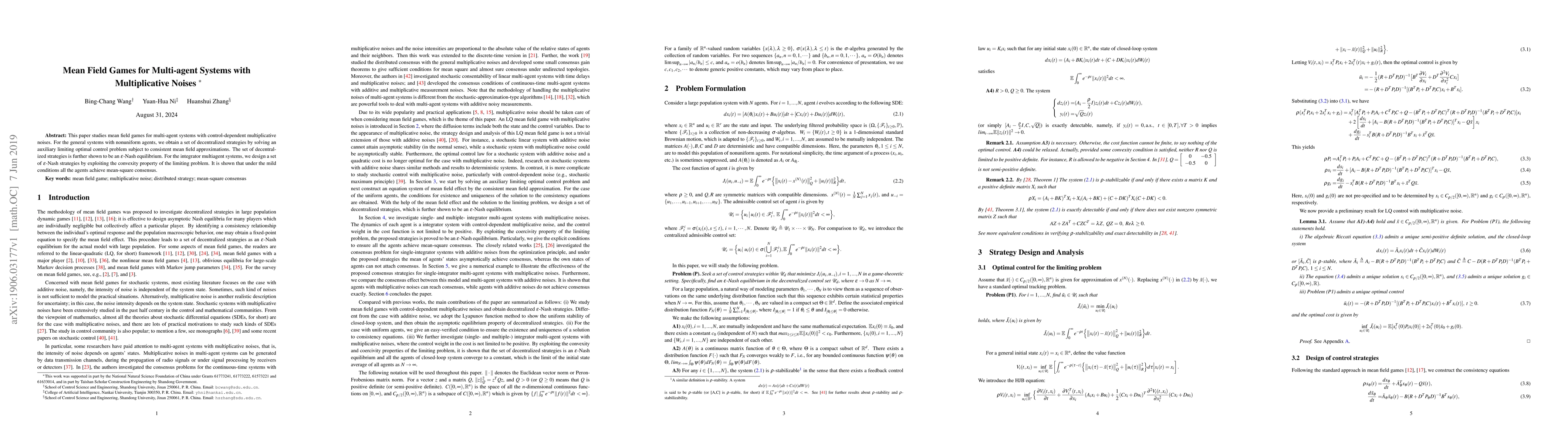 This paper studies mean field games for multi-agent systems with control-dependent multiplicative noises. For the general systems with nonuniform agents, we obtain a set of decentralized strategies by solving an auxiliary limiting optimal control problem subject to consistent mean field approximations. The set of decentralized strategies is further shown to be an $\varepsilon$-Nash equilibrium. For the integrator multiagent systems, we design a set of $\varepsilon$-Nash strategies by exploiting the convexity property of the limiting problem. It is shown that under the mild conditions all the agents achieve mean-square consensus.