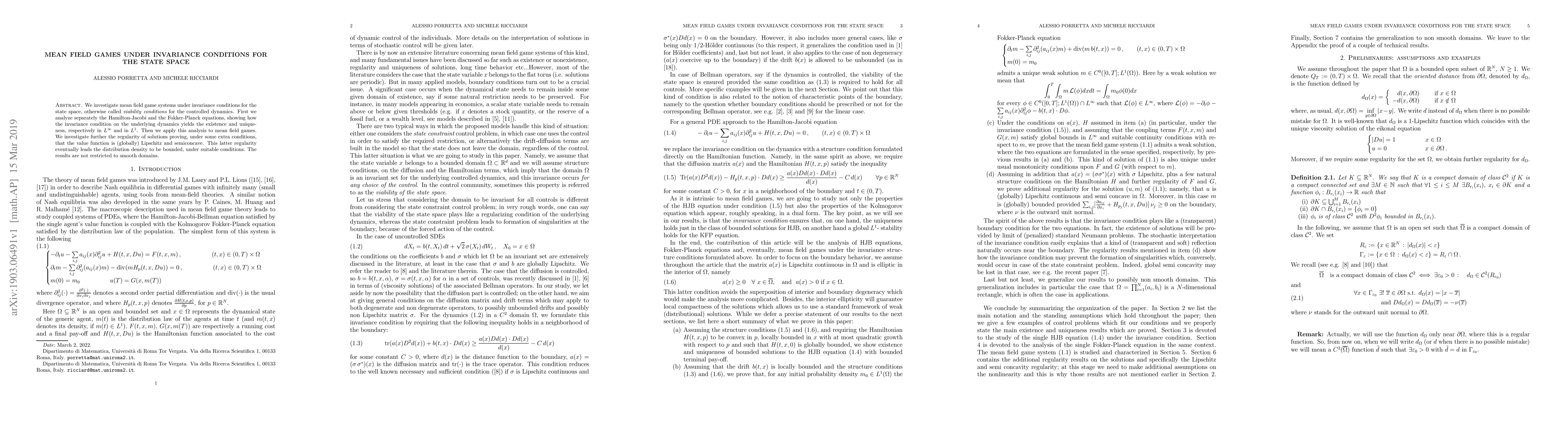 This paper investigates mean field games under invariance conditions for the state space, showing that these conditions lead to existence and uniqueness of solutions, as well as regularity of the value function and boundedness of distribution density.