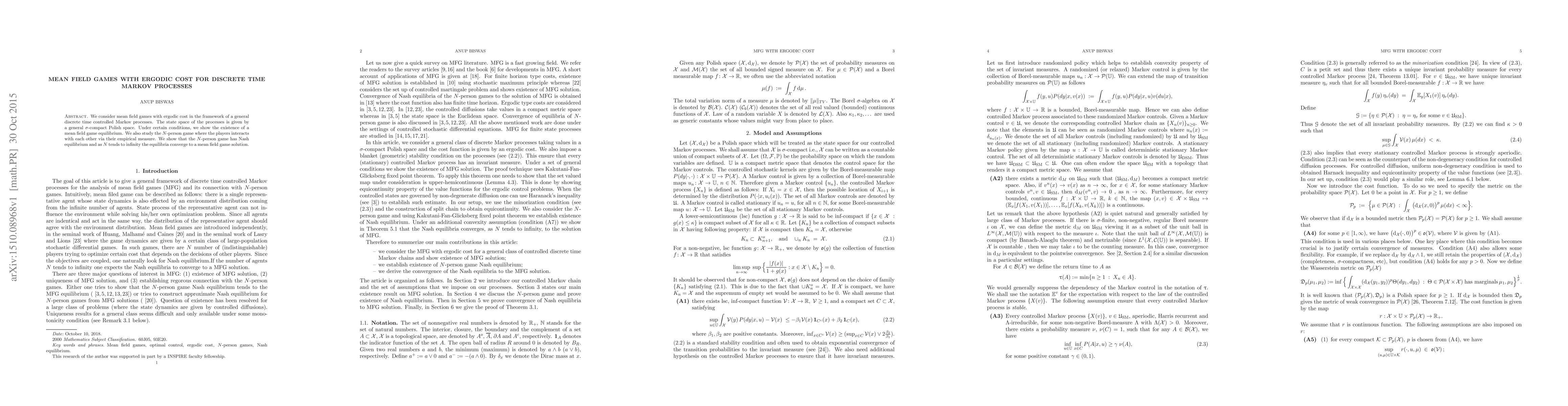 This paper explores mean field games with ergodic costs in discrete time Markov processes, proving the existence of a mean field game equilibrium under certain conditions. It also investigates the $N$-person game, demonstrating Nash equilibrium and convergence to a mean field game solution as $N$ approaches infinity.
