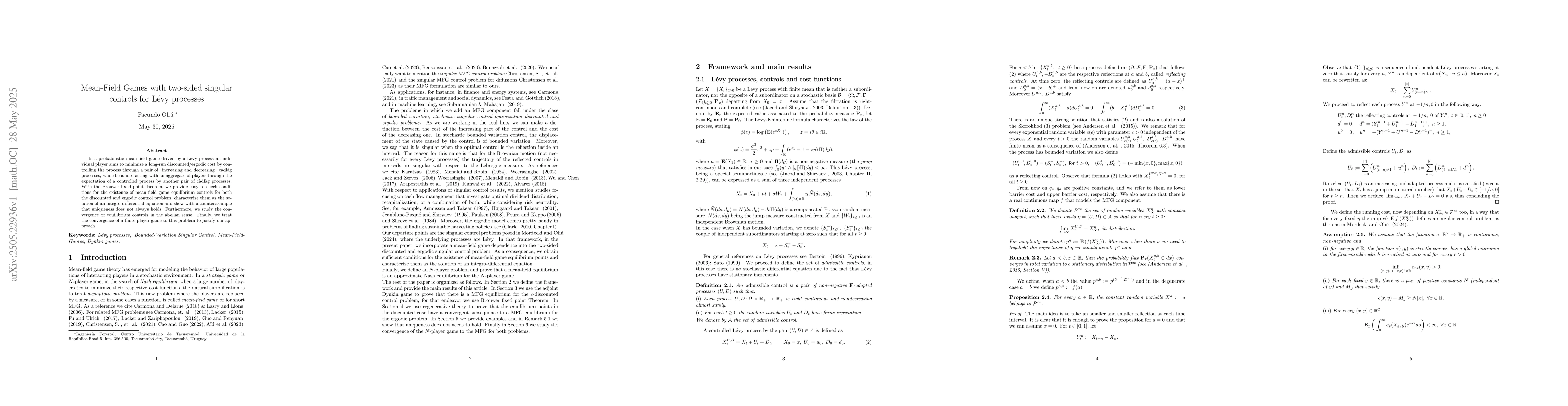 The work extends existing mean-field game theory by incorporating two-sided singular controls for Lévy processes and providing a fixed-point-based approach to establish equilibrium conditions, filling a gap in the literature.