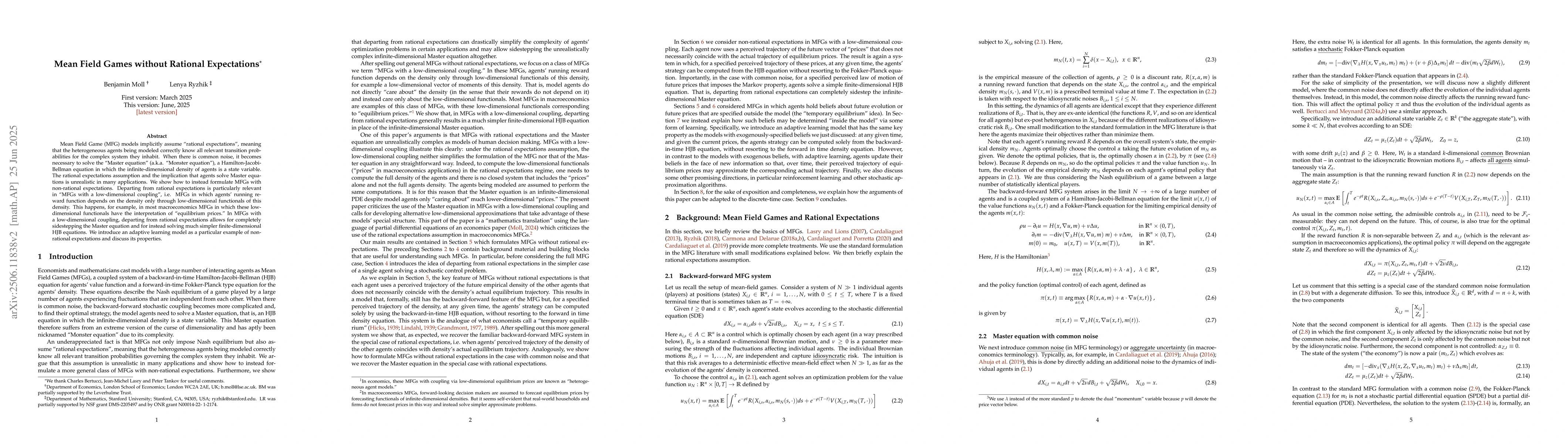 Mean Field Game (MFG) models implicitly assume "rational expectations", meaning that the heterogeneous agents being modeled correctly know all relevant transition probabilities for the complex system they inhabit. When there is common noise, this assumption results in the "Master equation" (a.k.a. "Monster equation"), a Hamilton-Jacobi-Bellman equation in which the infinite-dimensional density of agents is a state variable. The rational expectations assumption and the implication that agents solve Master equations is unrealistic in many applications. We show how to instead formulate MFGs with non-rational expectations. Departing from rational expectations is particularly relevant in "MFGs with a low-dimensional coupling", i.e. MFGs in which agents' running reward function depends on the density only through low-dimensional functionals of this density. This happens, for example, in most macroeconomics MFGs in which these low-dimensional functionals have the interpretation of "equilibrium prices." In MFGs with a low-dimensional coupling, departing from rational expectations allows for completely sidestepping the Master equation and for instead solving much simpler finite-dimensional HJB equations. We introduce an adaptive learning model as a particular example of non-rational expectations and discuss its properties.