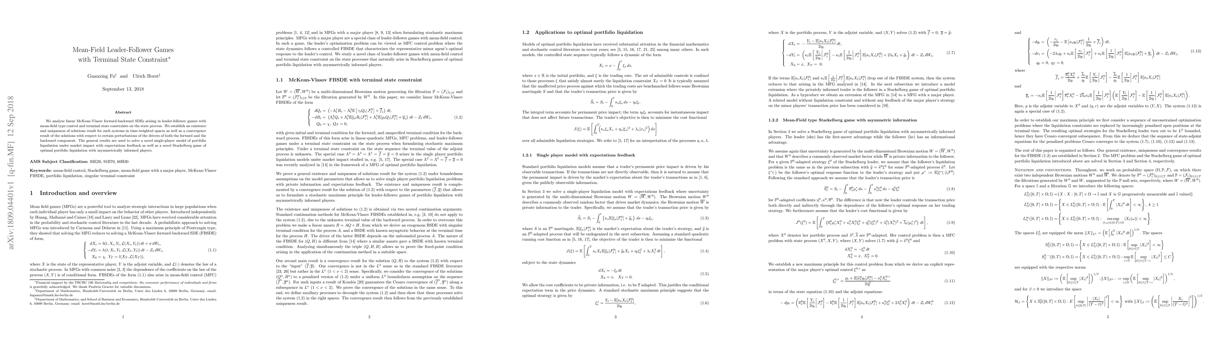 We analyze linear McKean-Vlasov forward-backward SDEs arising in leader-follower games with mean-field type control and terminal state constraints on the state process. We establish an existence and uniqueness of solutions result for such systems in time-weighted spaces as well as a {convergence} result of the solutions with respect to certain perturbations of the drivers of both the forward and the backward component. The general results are used to solve a novel single-player model of portfolio liquidation under market impact with expectations feedback as well as a novel Stackelberg game of optimal portfolio liquidation with asymmetrically informed players.