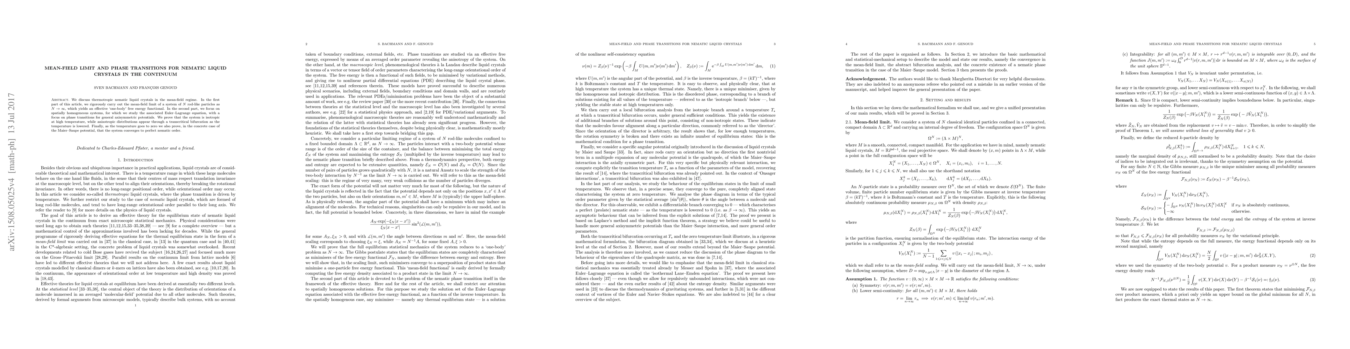 We discuss thermotropic nematic liquid crystals in the mean-field regime. In the first part of this article, we rigorously carry out the mean-field limit of a system of $N$ rod-like particles as $N\to\infty$, which yields an effective `one-body' free energy functional. In the second part, we focus on spatially homogeneous systems, for which we study the associated Euler-Lagrange equation, with a focus on phase transitions for general axisymmetric potentials. We prove that the system is isotropic at high temperature, while anisotropic distributions appear through a transcritical bifurcation as the temperature is lowered. Finally, as the temperature goes to zero we also prove, in the concrete case of the Maier-Saupe potential, that the system converges to perfect nematic order.