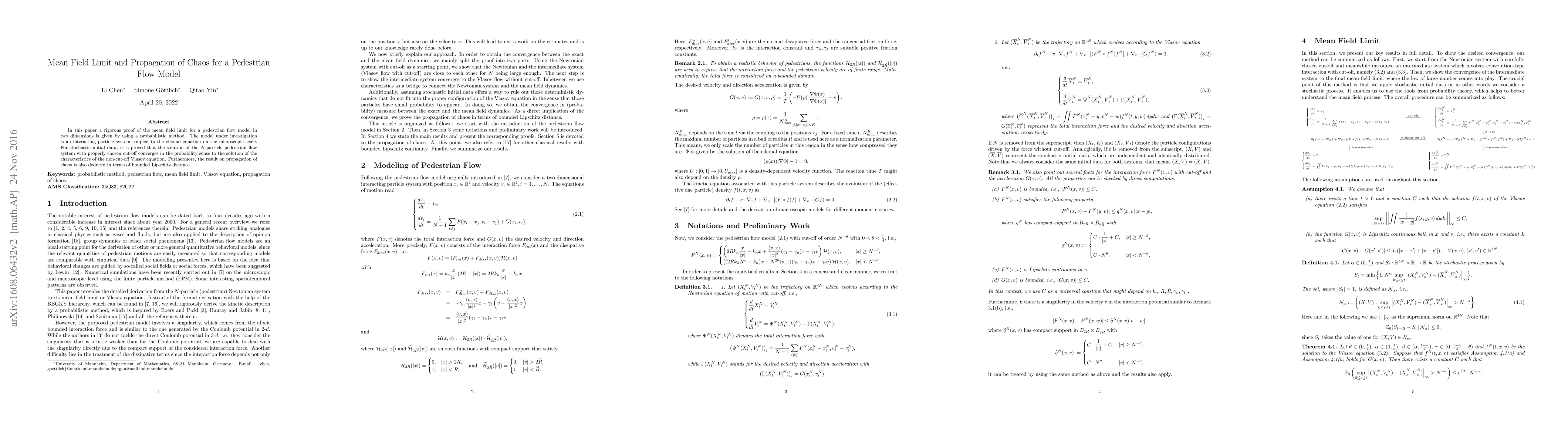 This paper rigorously proves the mean field limit for a two-dimensional pedestrian flow model using probabilistic methods, demonstrating convergence of the $N$-particle system to the Vlasov equation solution. Additionally, it establishes the propagation of chaos in terms of bounded Lipschitz distance for stochastic initial data.